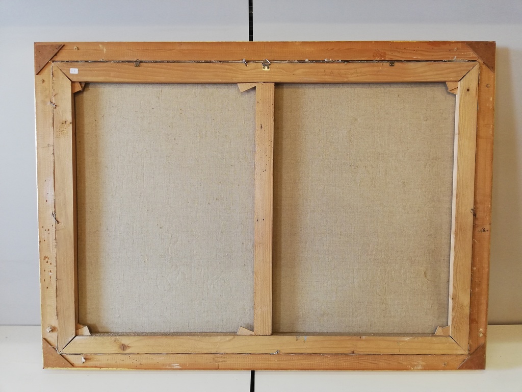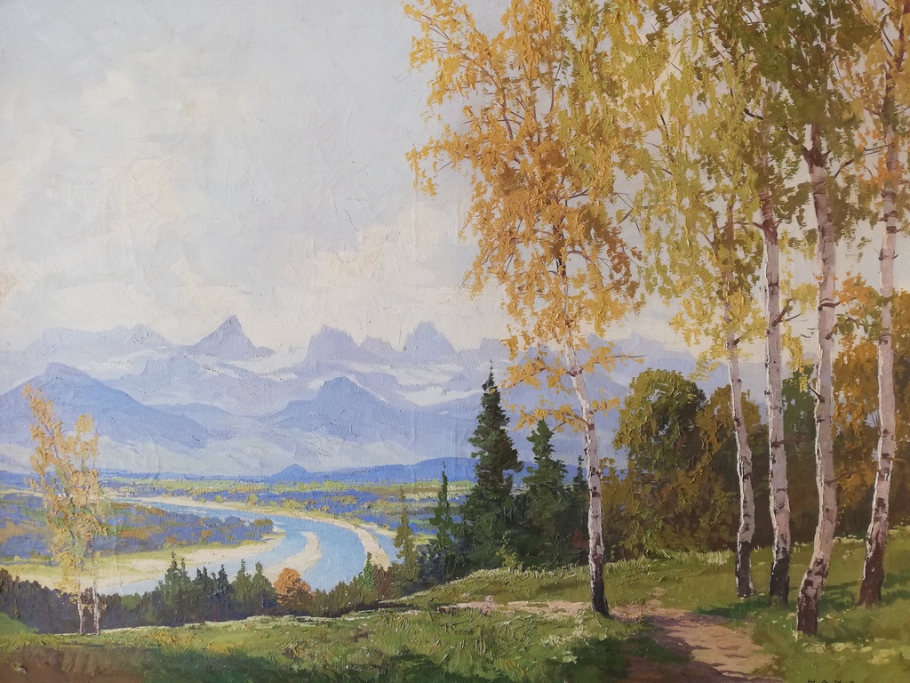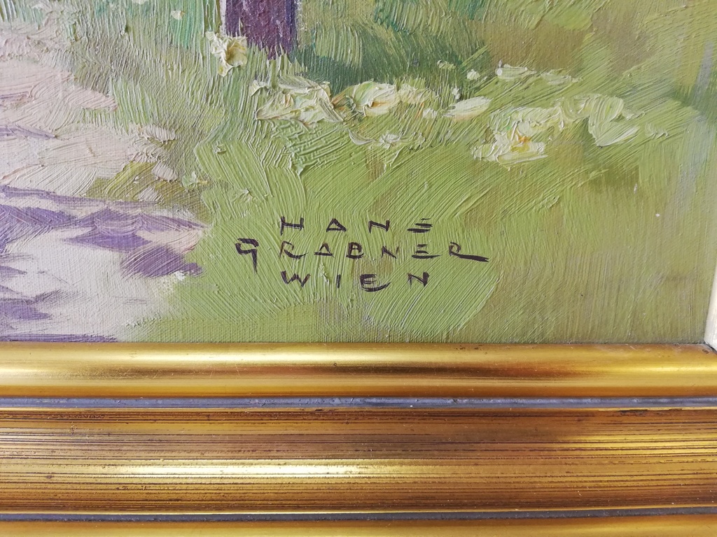 20. Jhdt. ,, Isartal " Flusslandschaft mit Bergen im Hintergrund, signiert Hans Grabner Wien, Öl auf Leinwand, gerahmt, Rahmen mit Mängel, geringe Oberflächenmängel