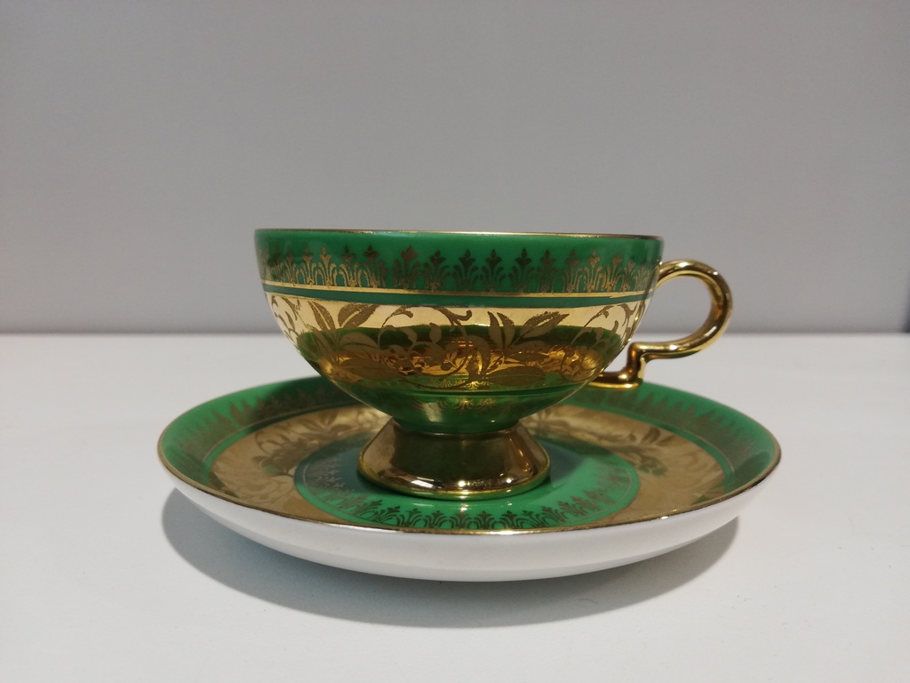 jeweils eine Tasse in hellblau, dunkelblau, grün, rot,schwarz, aller Tassen glanzvergoldet