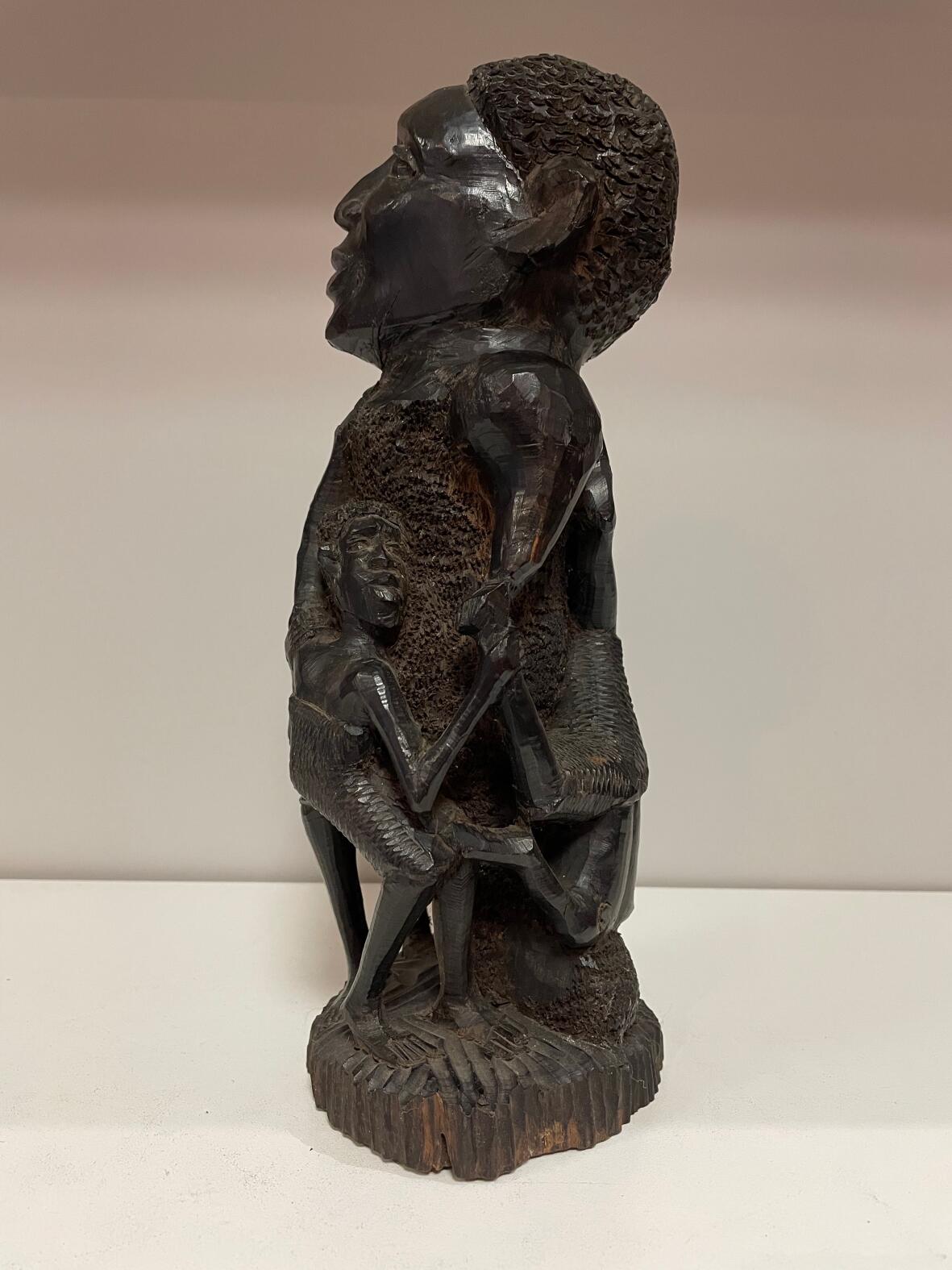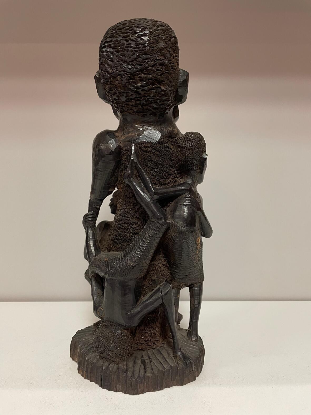 Darstellung: Kinder, die sich aneinander und an einen Erwachsenen klammern, sehr schweres Hartholz, handgeschnitzt