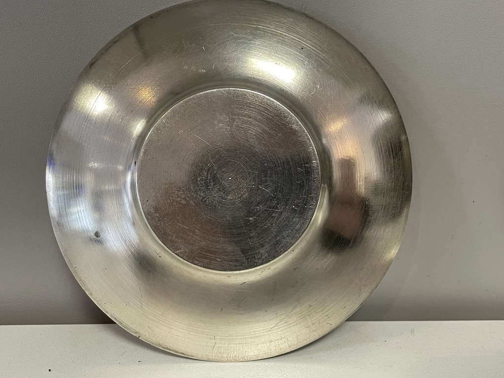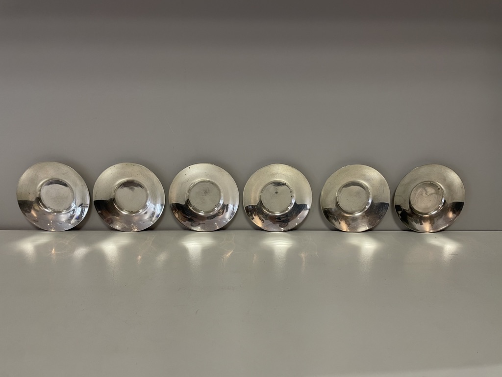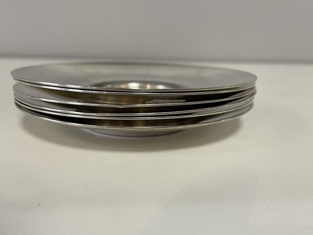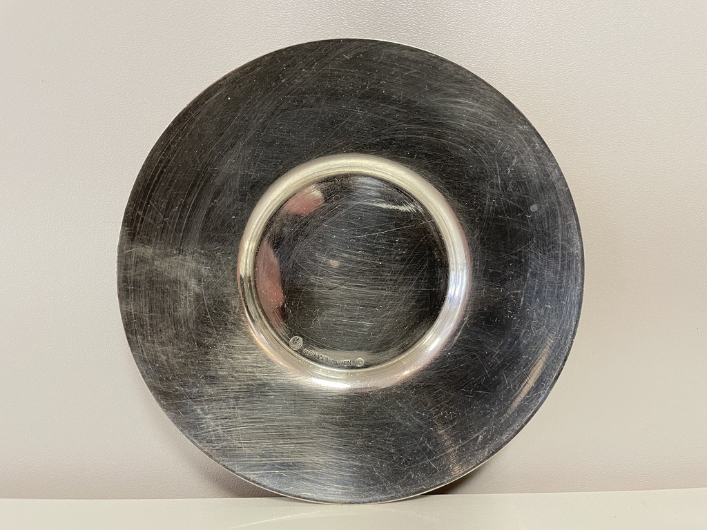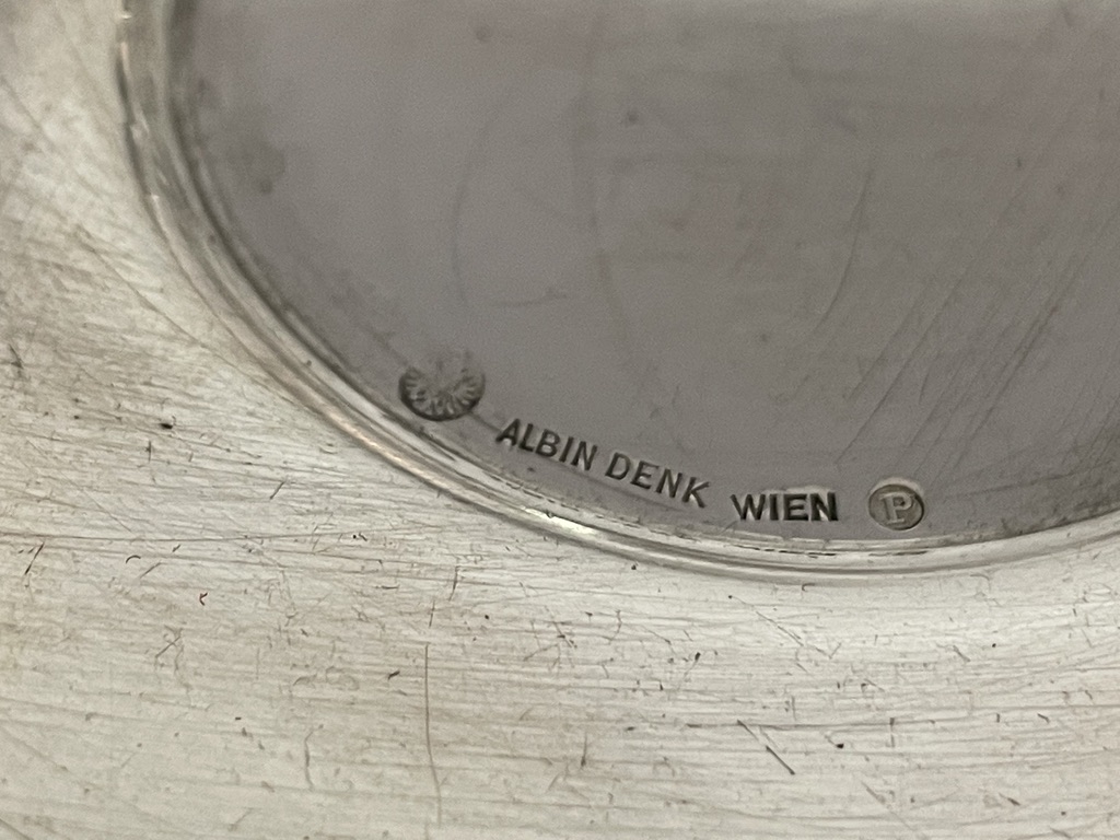 Marke: Punzierung im Tellerspiegel: Doppeladler und "ALBIN DENK WIEN" und "P" in Kreis, Albin Denk, gegründet 1702, ist ein heute noch bestehendes Tafel-Ausstattungs-Geschäft in der Inneren Stadt in Wien (Bräunerstraße 3), das die Untersetzer im Auftrag bei einer unbekannten Metallwarenfabrik (vielleicht Berndorf, Argentor, Orivit oder WMF) herstellen hat lassen