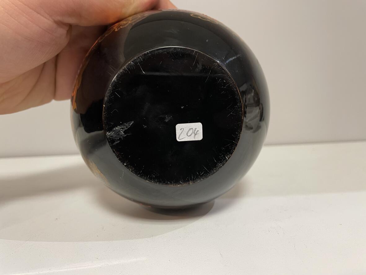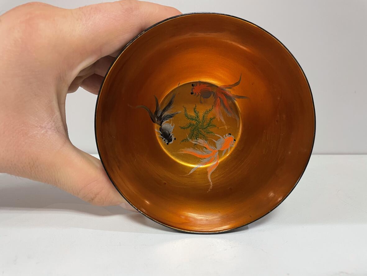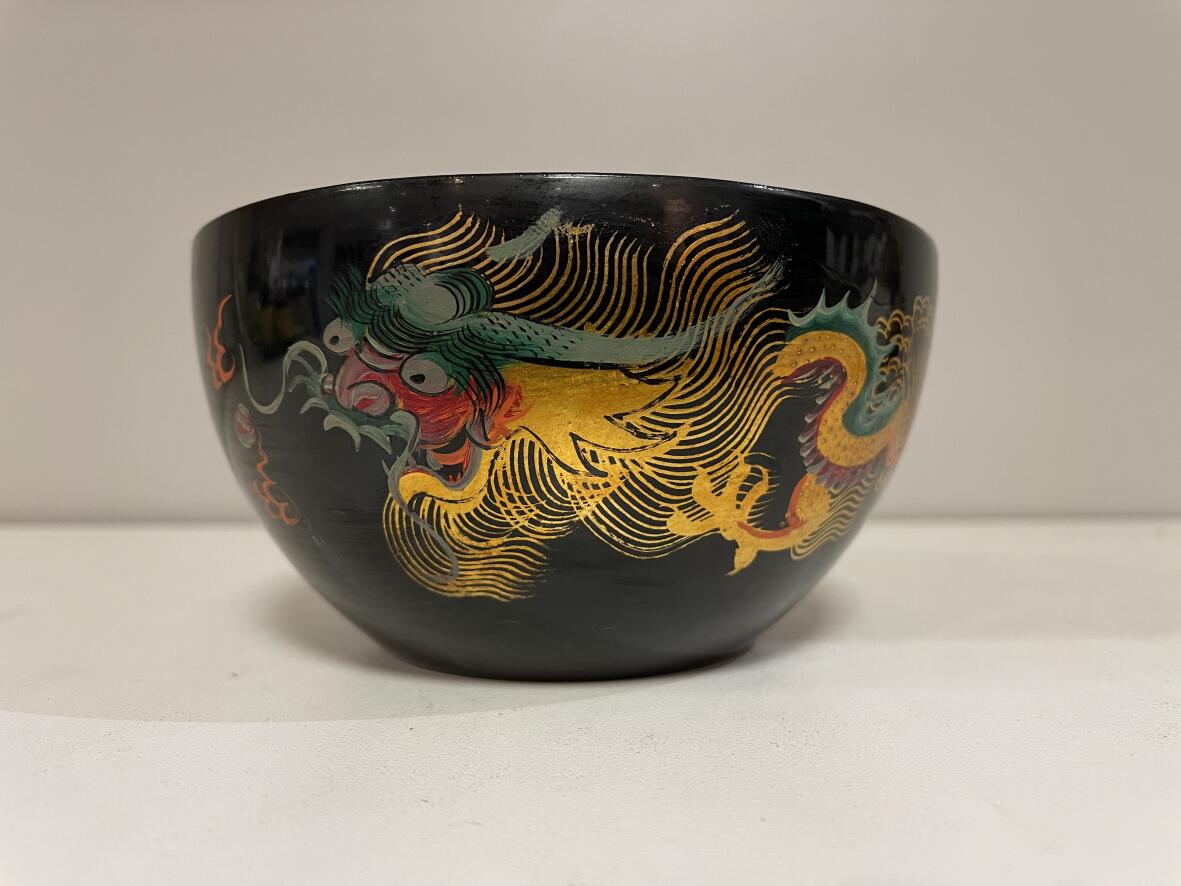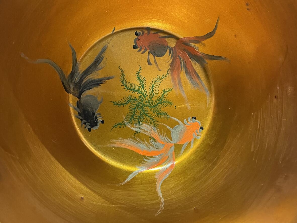 Darstellung: außen gemalter goldener Drache, innen gemalte Wassertiere auf kupferfarbenem Hintergrund