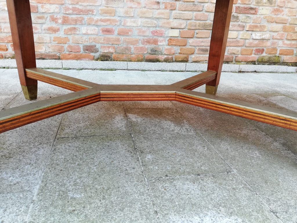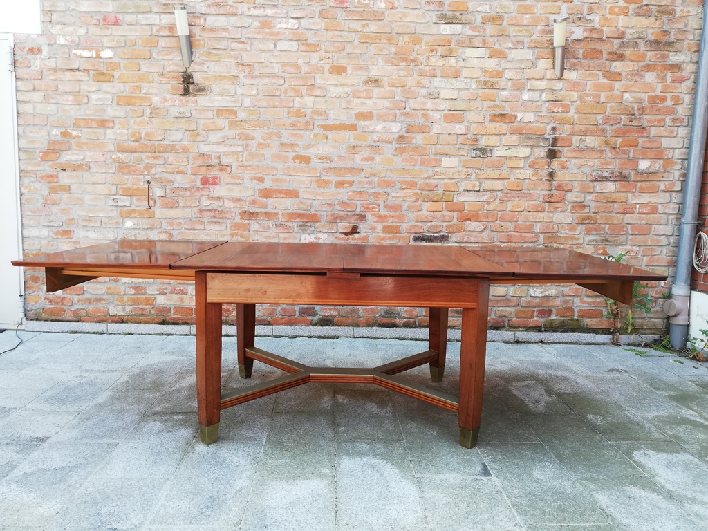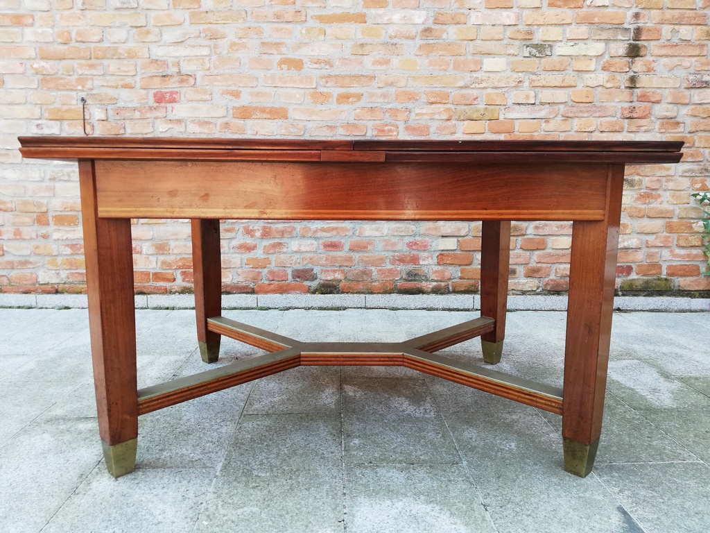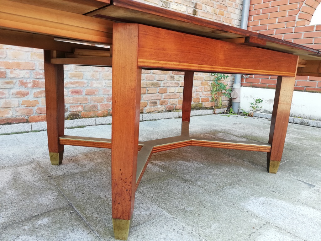 Entwurf und Ausführung der Firma August Ungethüm in Wien um 1905, tw. Fichtenholz, palisanderfurniert, mit Buchsbaum Bandwerkmarketerie gezierter Zargenbereich, 2 integrierte Vergrößerungsbretter, Füße mit Metallschuhen, 80 x 135 x 105 cm, ausziehbar auf ca. 250 cm