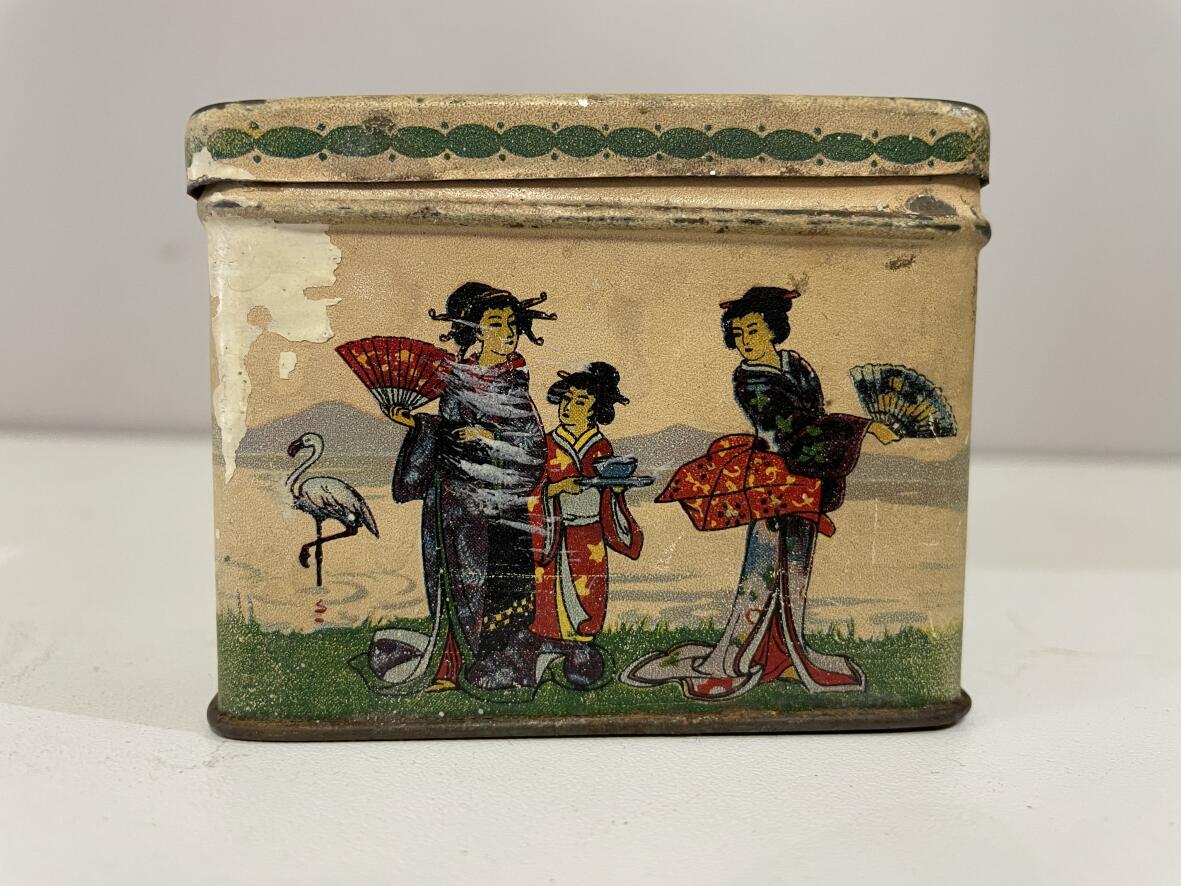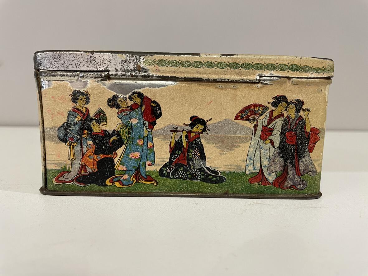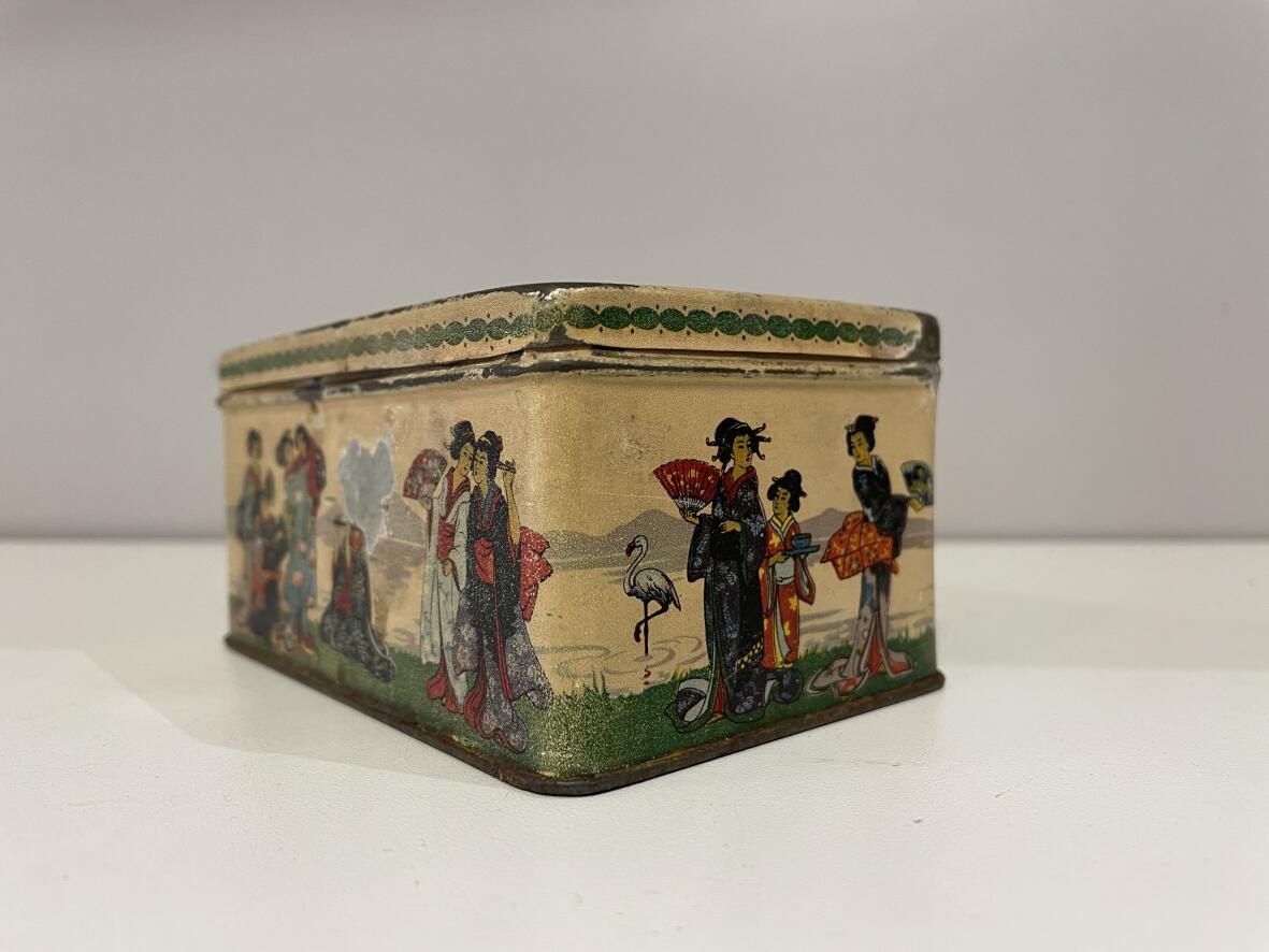 (Weitere Suchbegriffe: Eisendose, Vintage, Design, Midcentury, Teedose, Teecaddy, Lithografie)