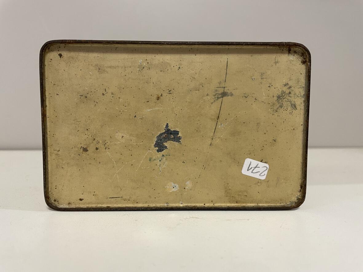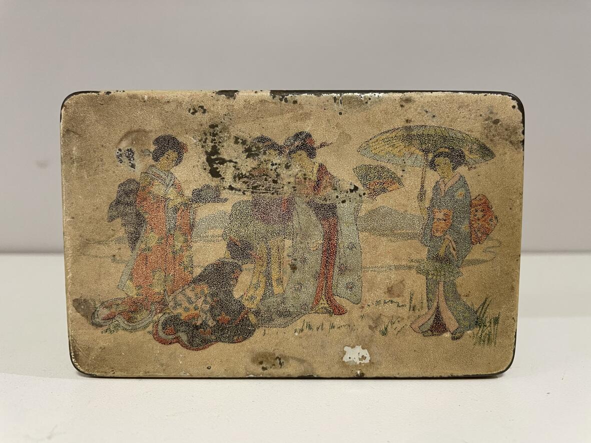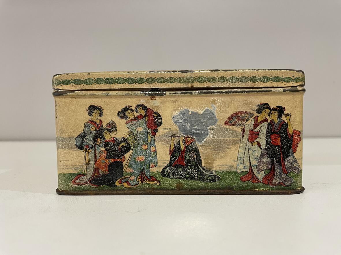 (Weitere Suchbegriffe: Eisendose, Vintage, Design, Midcentury, Teedose, Teecaddy, Lithografie)