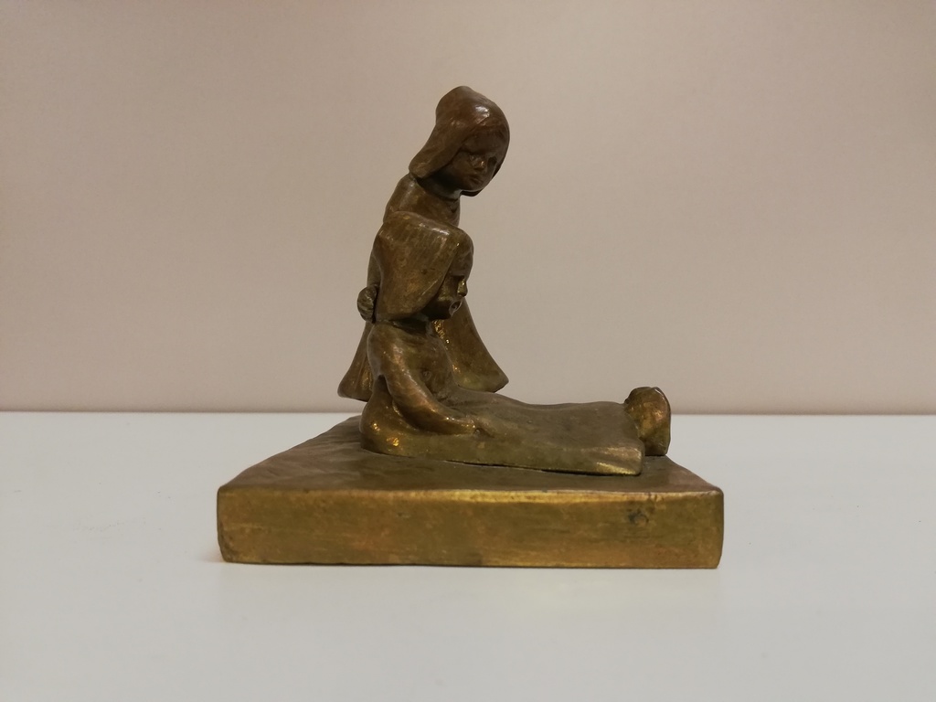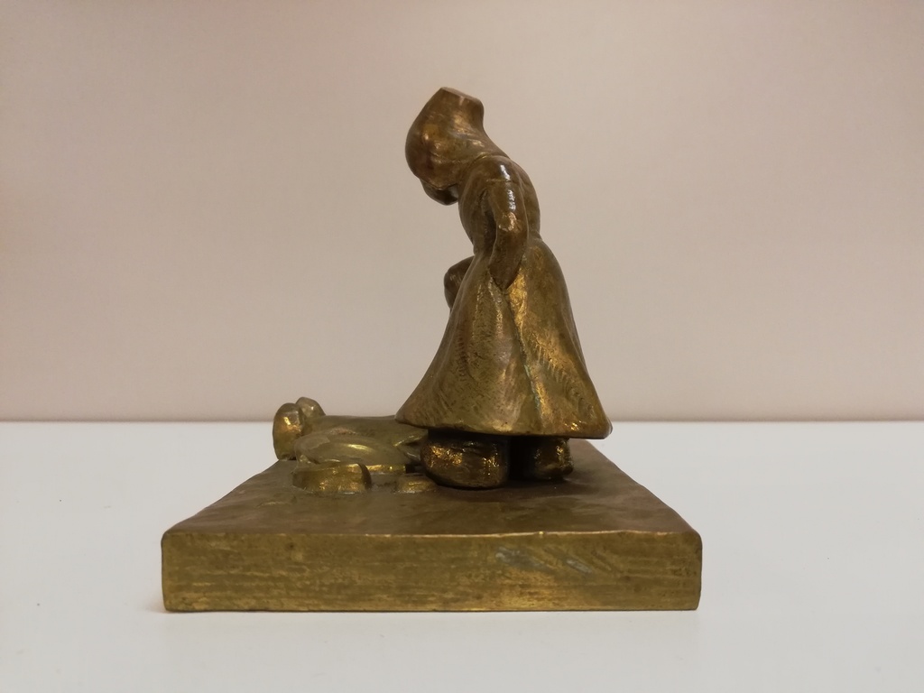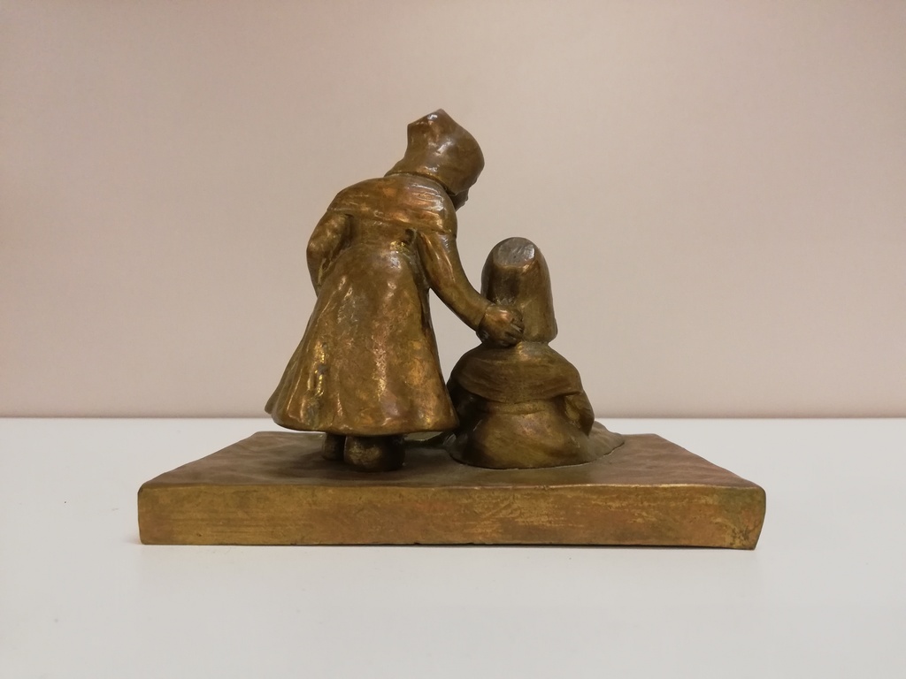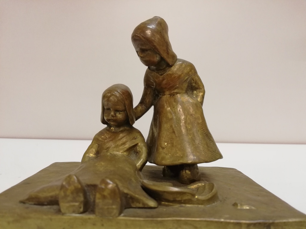 Motiv: neben zerbrochenem Teller sitzt Kind, rechts daneben stehendes Kind hält Hand auf Rücken des sitzenden Kindes, zur Beruhigung, Kopfbedeckungen eventuell holländisch