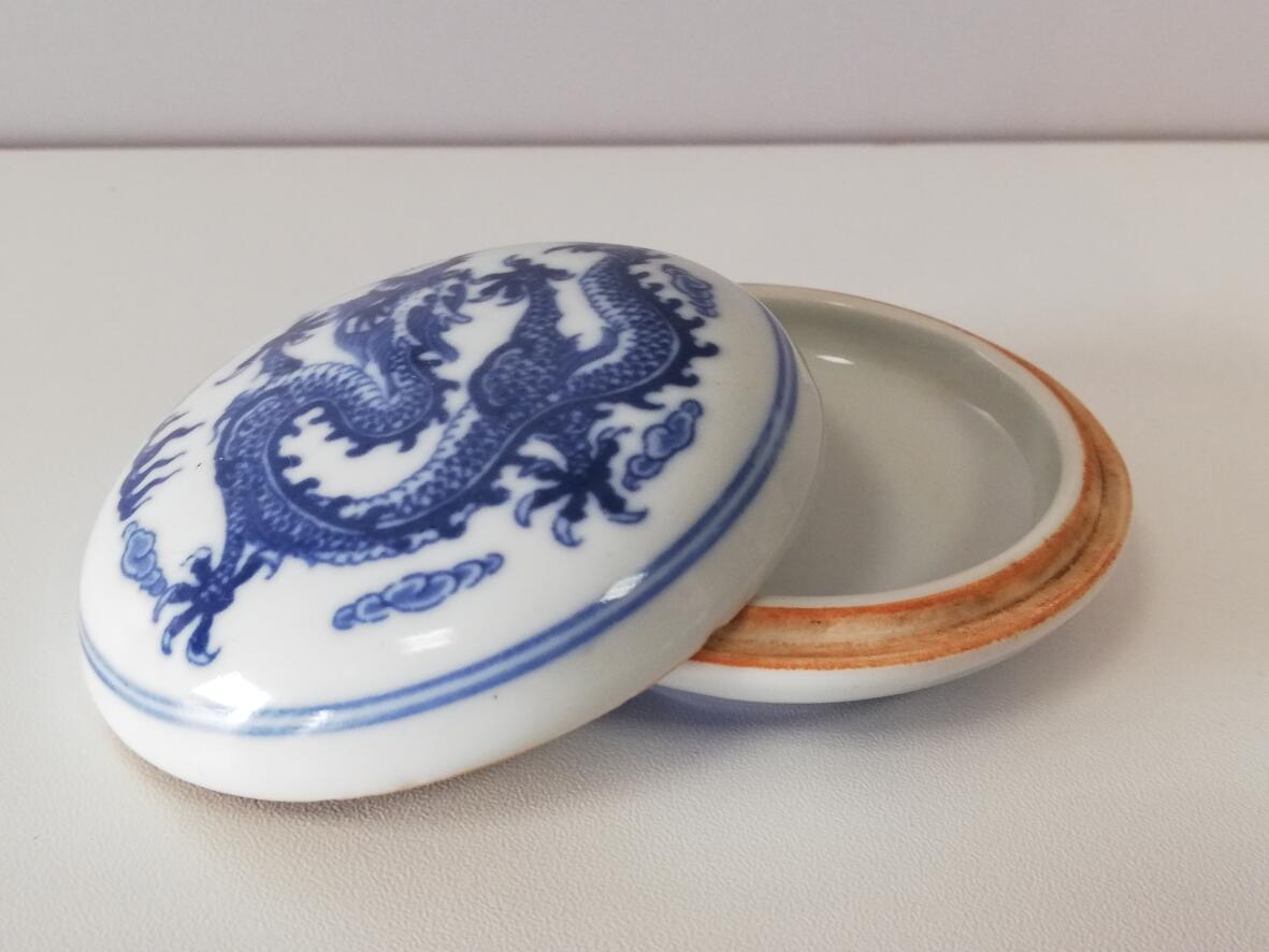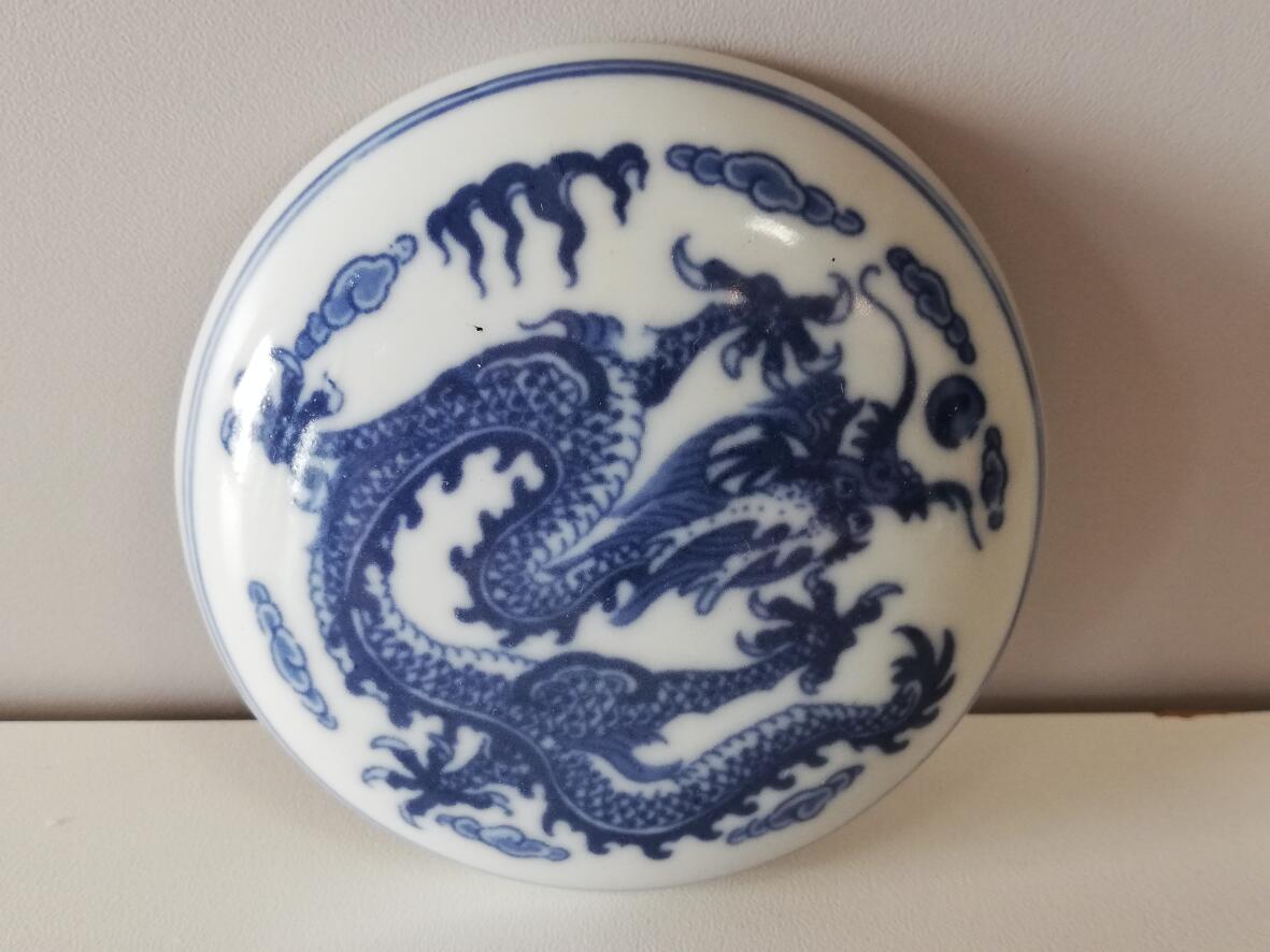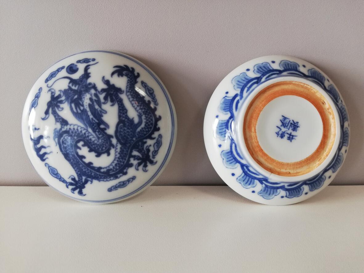 unterglasurblauer Dekor mit Drachen am Deckel, am Boden asiatische Marke / Signatur