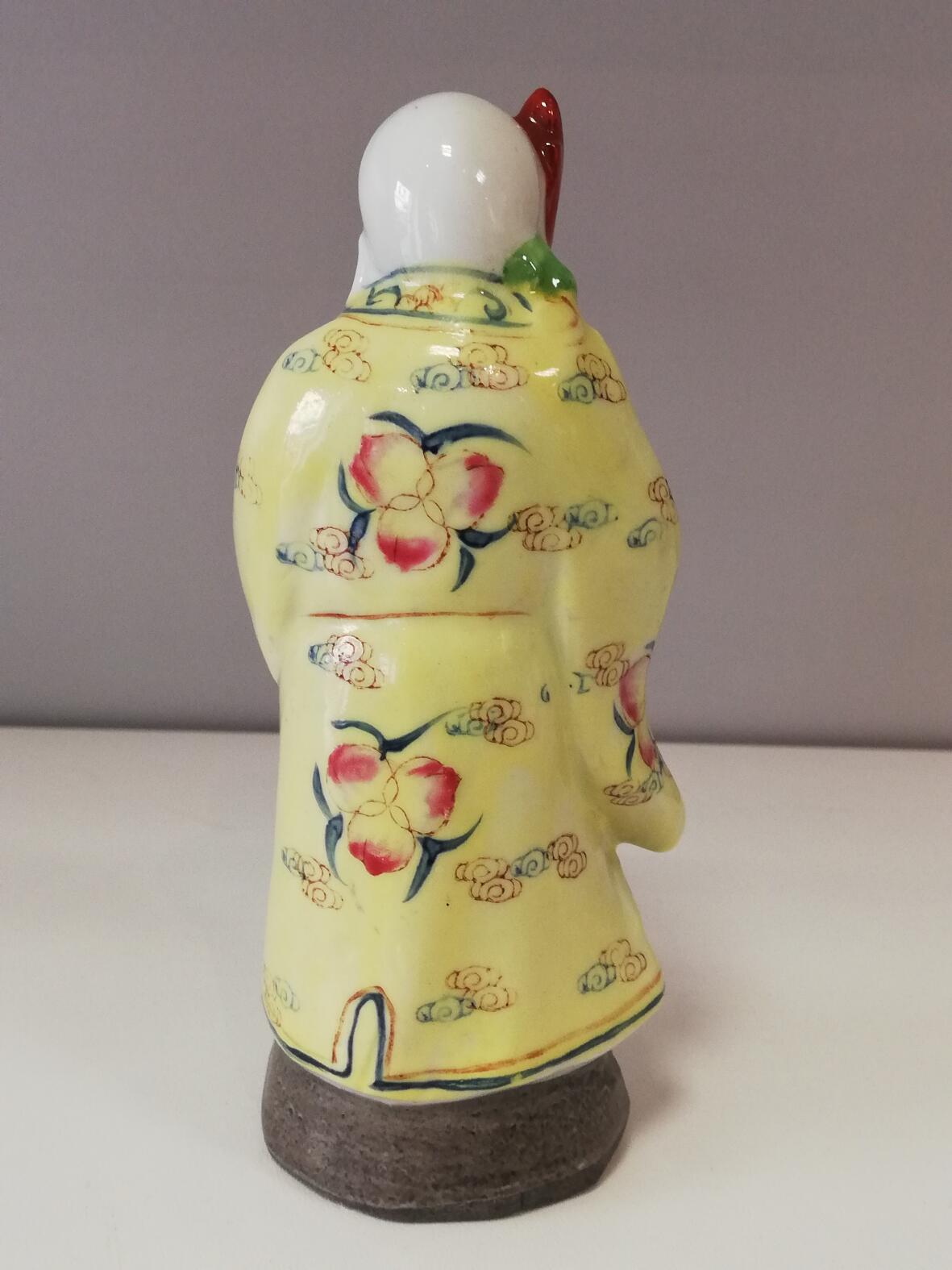 Motiv: Chinesischer Gelehrter in gelbem Gewand mit Stab und Frucht in Hand.