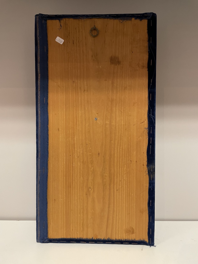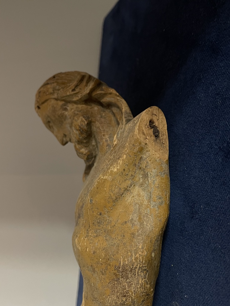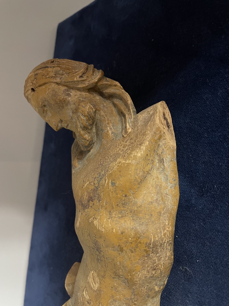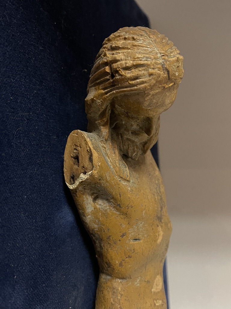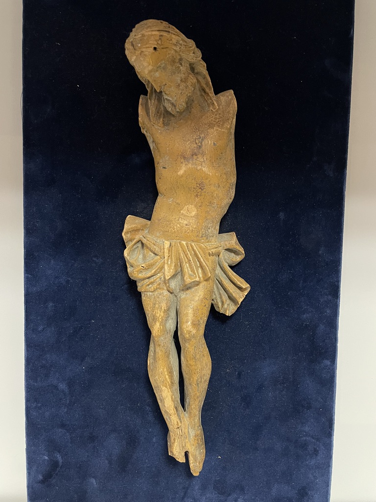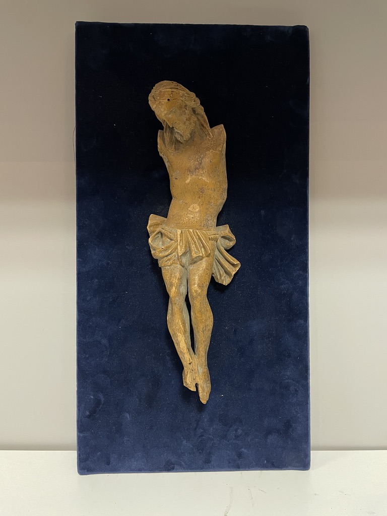 Holzplatte mit blauem Samt überzogen, Chistus handgeschnitzt und mit Ocker übermalt