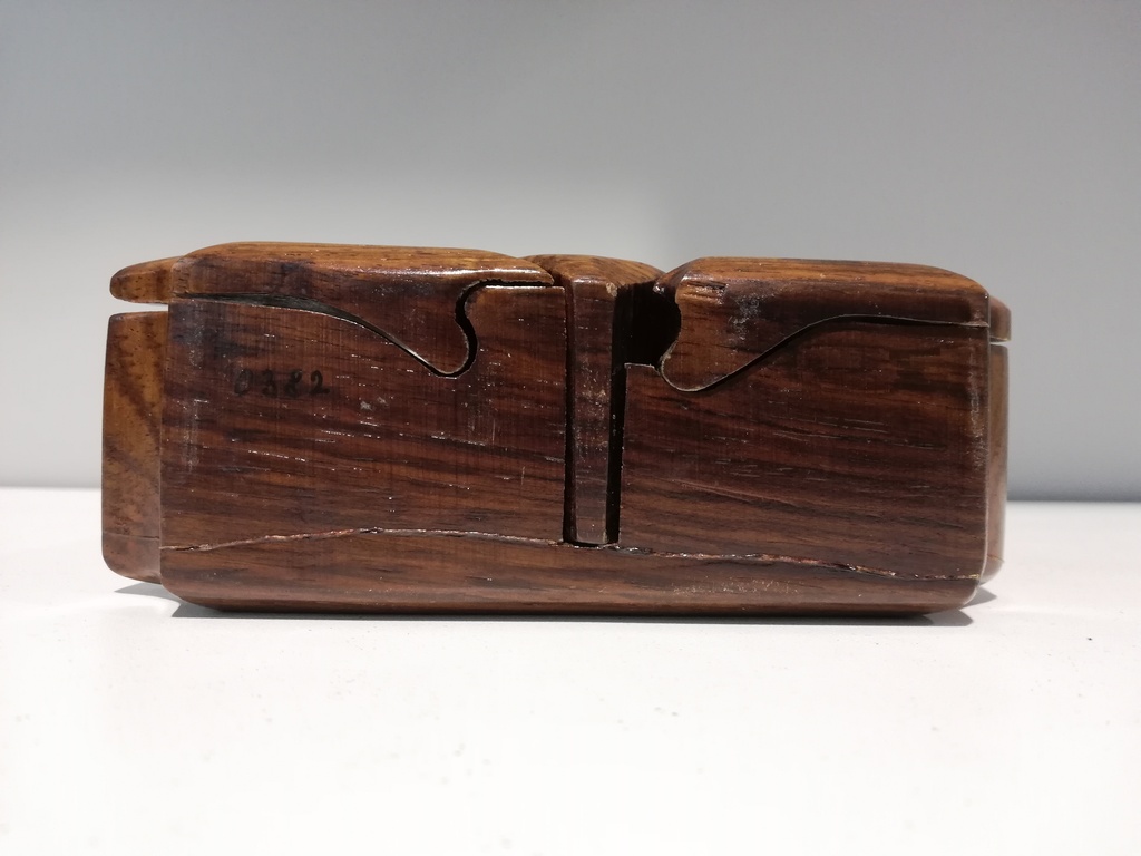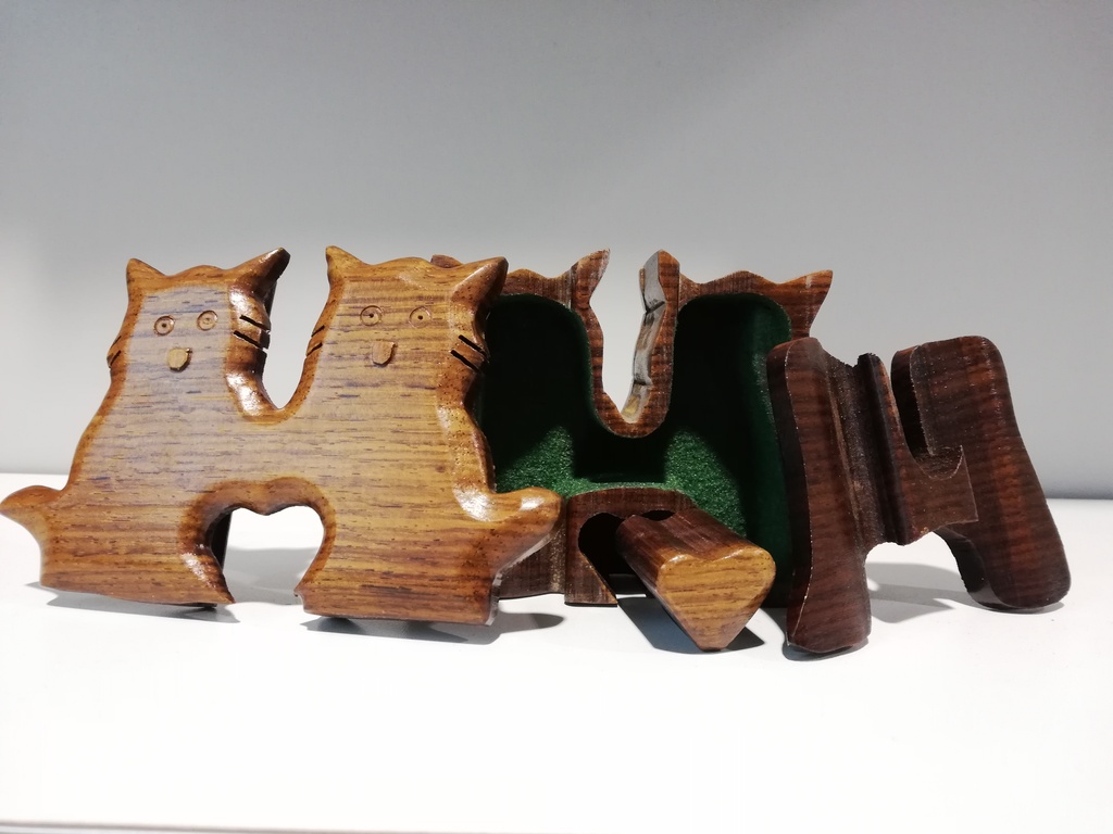 20.Jhdt. schiebt man Herzerl raus kann man Katzendeckel abnehmen, darunter weiterer Deckel, darunter grün ausgeschlagenes Dosenfach