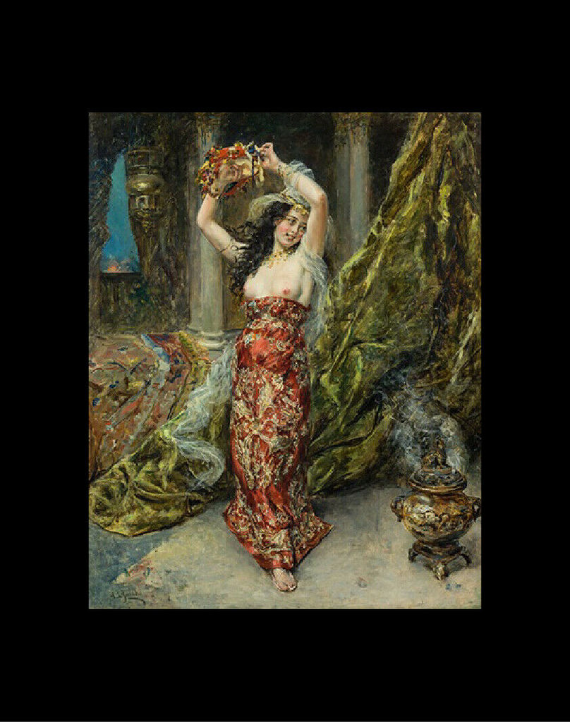 Dieses Gemälde zeigt eine tanzende junge Orientalin mit einem Tamburin. Die leuchtenden Farben, sowie der freie Pinselstrich vermitteln kunstvoll die ausgelassene Stimmung dieser musikalischen Szene. 1856 in Madrid geboren, erhielt Eduardo León Garrido seine künstlerische Ausbildung in der Escuela Superior de Madrid wo er bei Vicente Palmaroli studierte. Dank eines Stipendiums konnte er über Rom und Venedig nach Paris reisen, wo er sein Studium fortsetzte. Dort nahm er die Einflüsse des Impressionismus auf, die in seinem gesamten weiteren Schaffen spürbar blieben. Auch in vorliegendem Werk sind diese französischen Eindrücke deutlich sichtbar: der Pinselstrich ist frei und die einzelnen Farbflecken vermischen sich zu einem harmonisch changierenden Kolorit. Details wie das leuchtende Rot des Kleides der Tänzerin mit den kunstvollen Verzierungen sowie das schimmernd-goldene Rauchgefäß im Vordergrund sind besonders zu betonen. Das Mädchen lächelt keck und zieht mit ihrer Bewegung den Betrachter in ihren Bann. Mit dem dunklen Haar, welches sanft über die Schultern fällt, dem orientalischen Schmuck und der verführerischen Stimmung schaffte es der Künstler die Faszination und Anziehungskraft des Exotischen festzuhalten. Ganz im Sinne der Belle Époque schuf Garrido vor allem galante Szenen in noblen Salons und ließ sich besonders von schönen Frauenmodellen inspirieren. 1892 heiratete er sogar eines seiner Modelle namens Léonie Beck. Schon früh stellte er auf den besten Messen in Paris, London und München aus und nahm schließlich ab 1905 eine Kunstprofessur in Frankreich an.