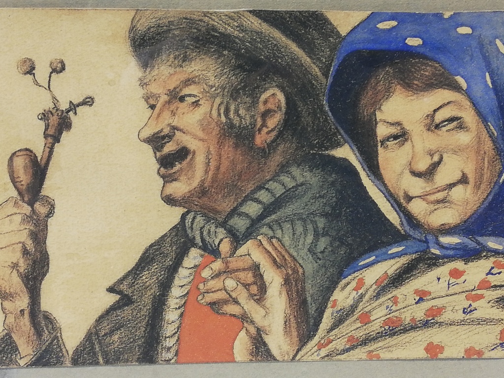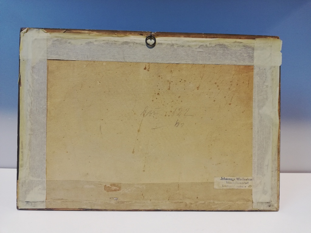Kohlezeichnung eines alten Ehepaares, Aufkleber Rückseite ,, Johanna v. Waclawiczek Wien - Enzersdorf Lichtensteinerstraße 49 ,,