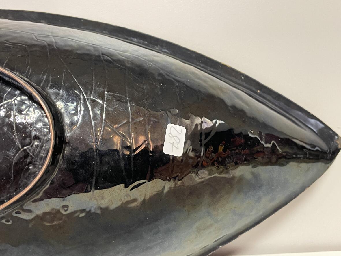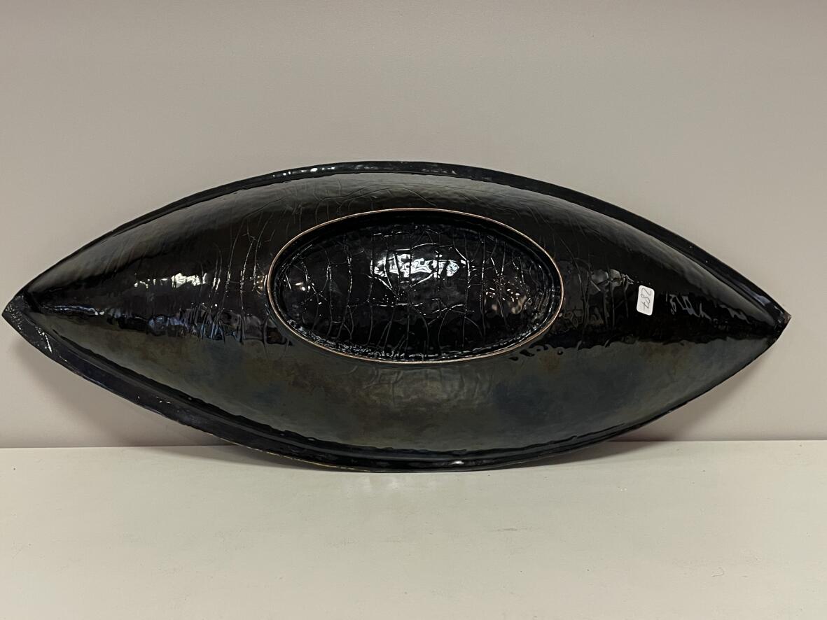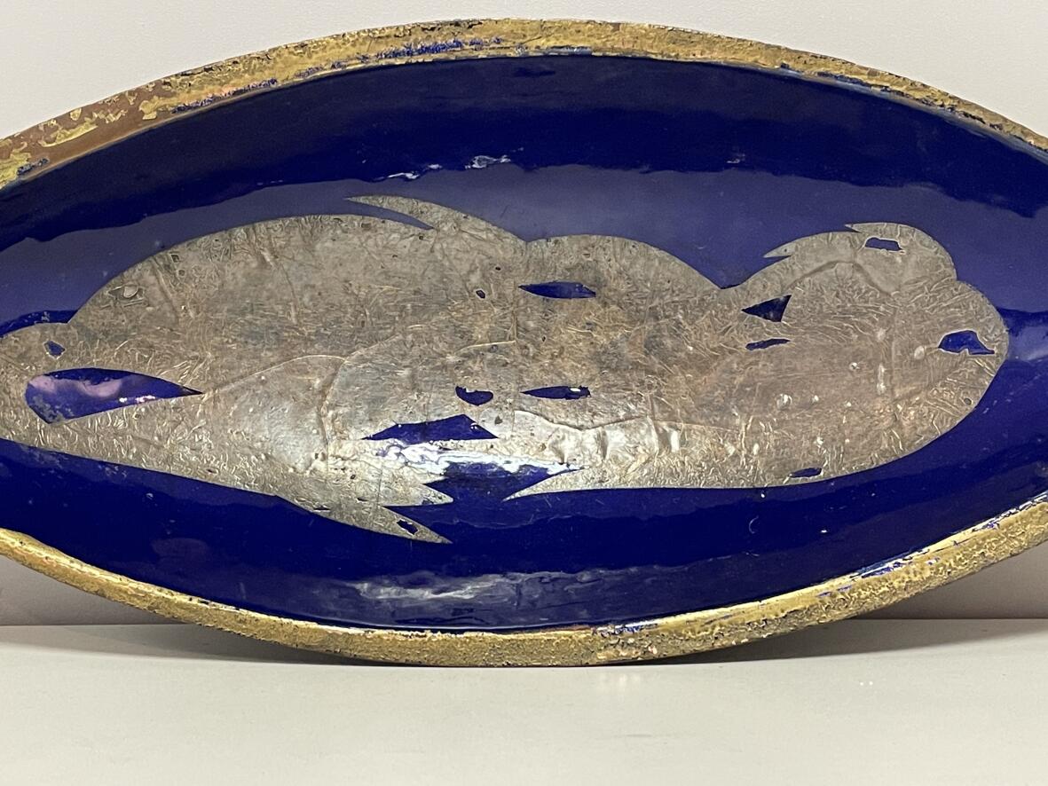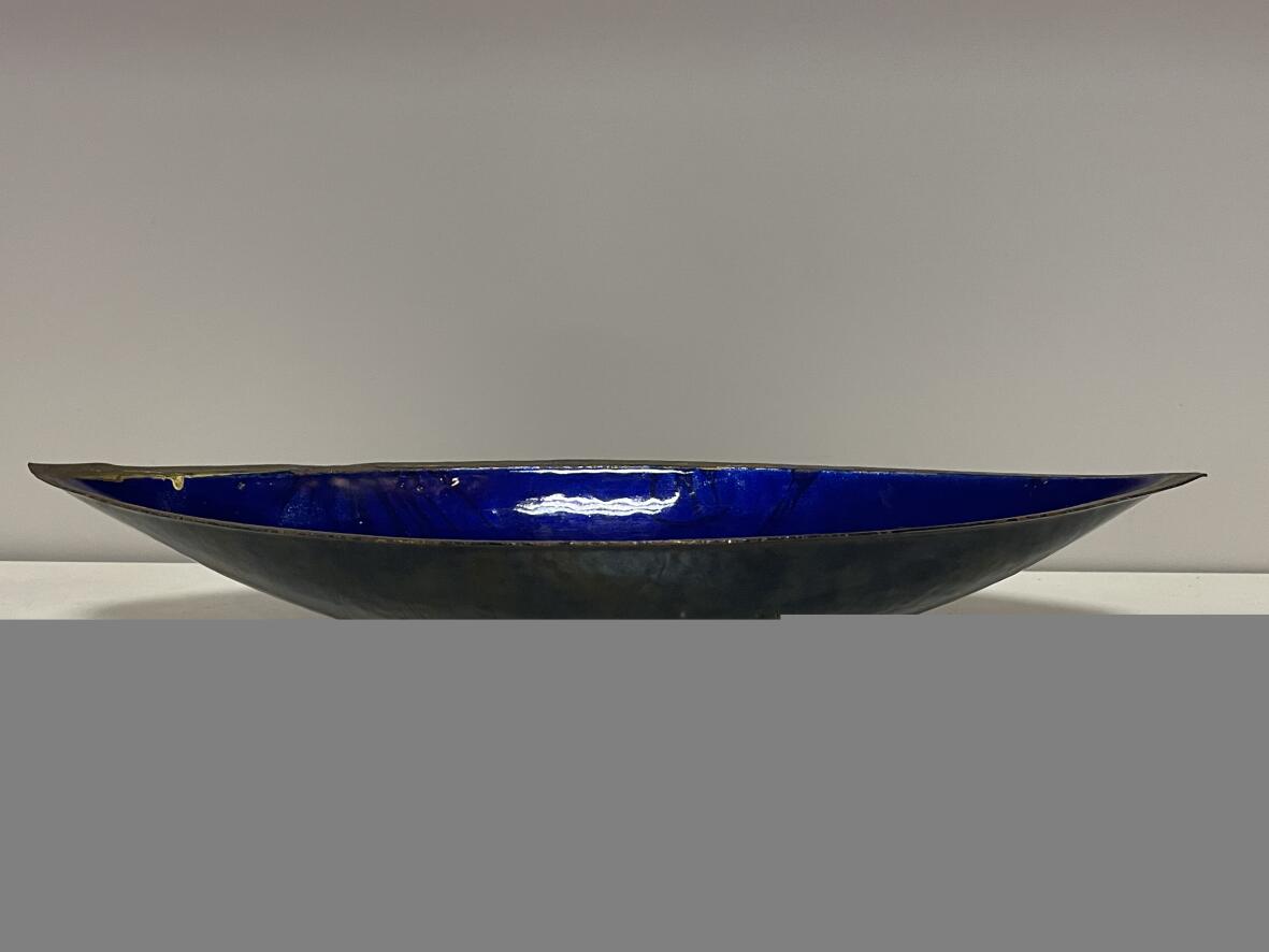 Künstlerarbeit, außen schwarz, innen blau emailliert; Schale vermutl. aus Bronze