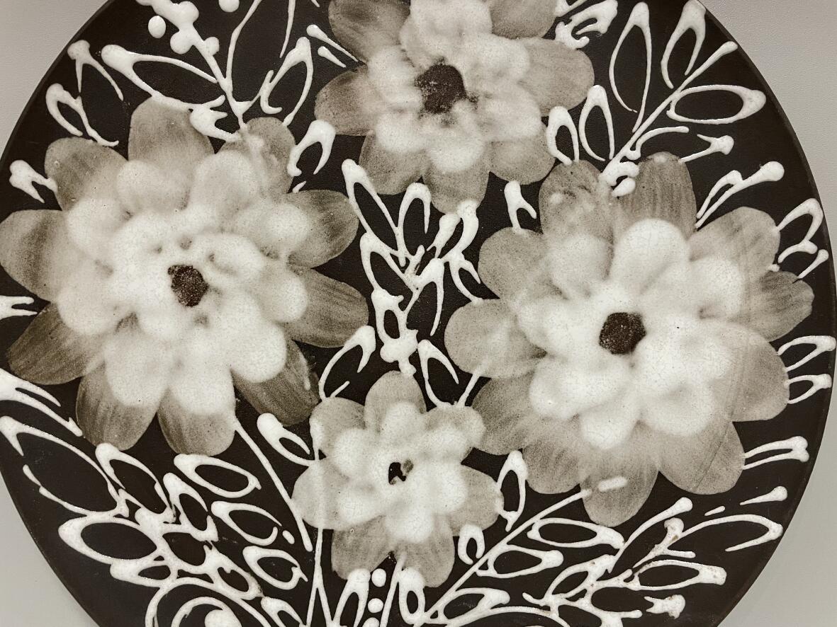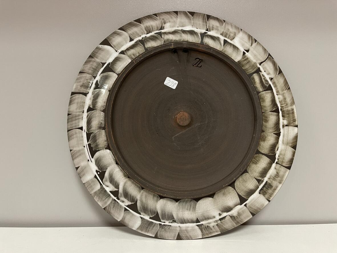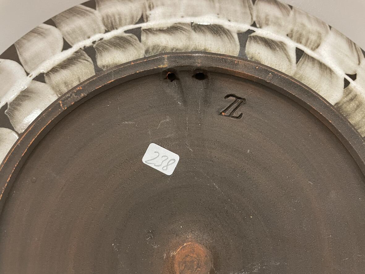 Weiße Engobe auf braunerm Keramikteller, matte Oberfläche; sehr schwer; Löcher für Schnur zum Aufhängen