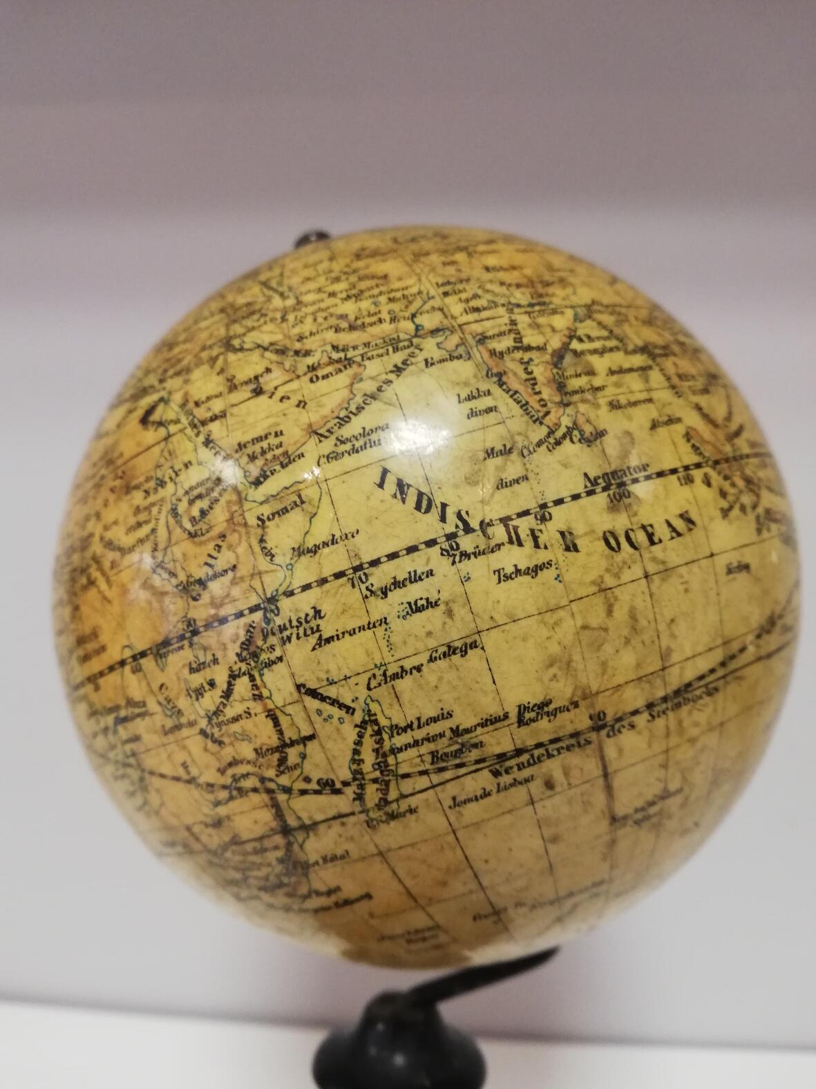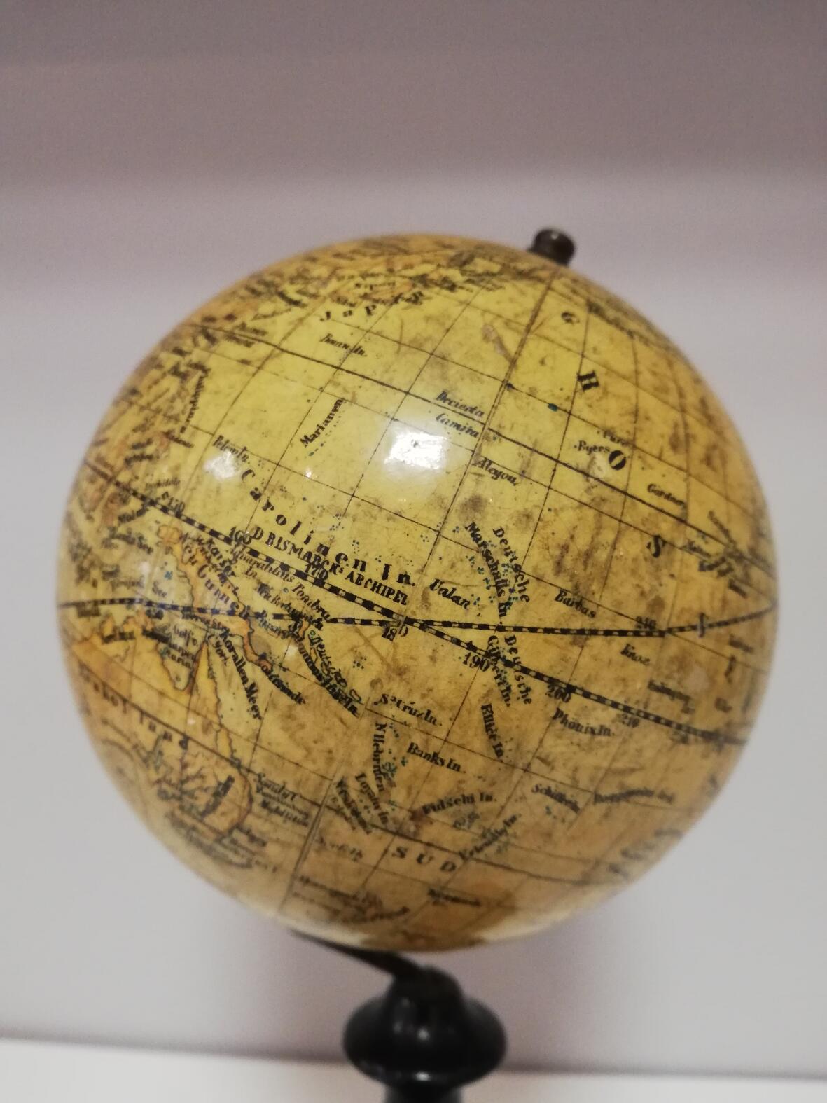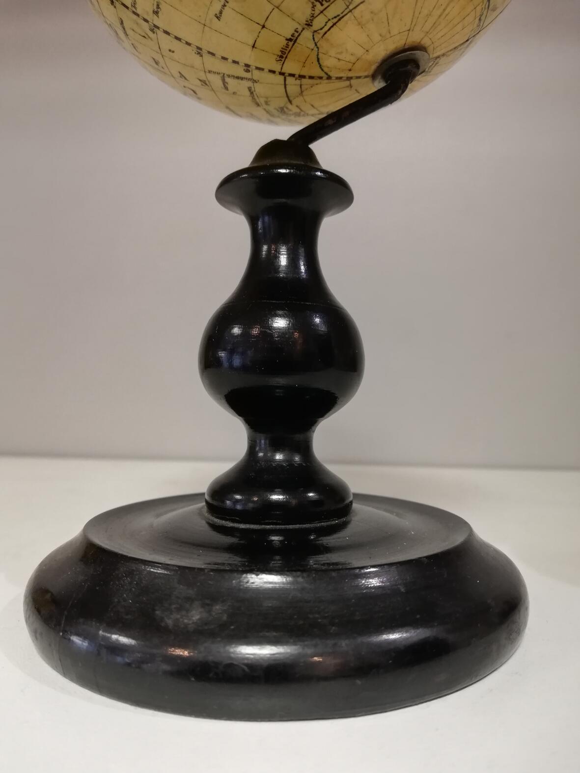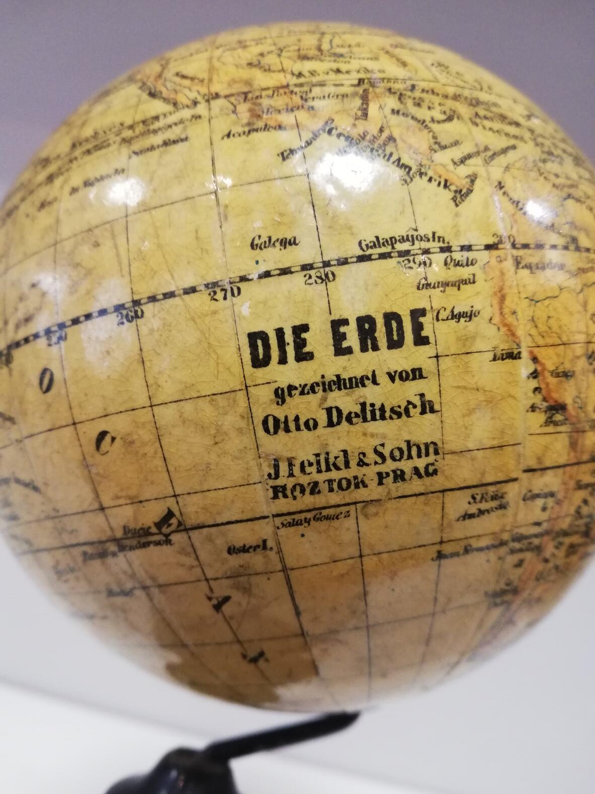 Rostock bei Prag um 1890, "DER GLOBUS / gezeichnet von / Prof. Dr. OTTO DELITSCH Leipzig / Verlag von J. Felkl & Sohn / Rostok bei Prag", Papiermache/Gipskugel mit lithographierten u. kolorierten Papiersegmenten, gedrechselter ebonisierter Holzfuß. Dm ca. 12 cm, Höhe ca. 24 cm.