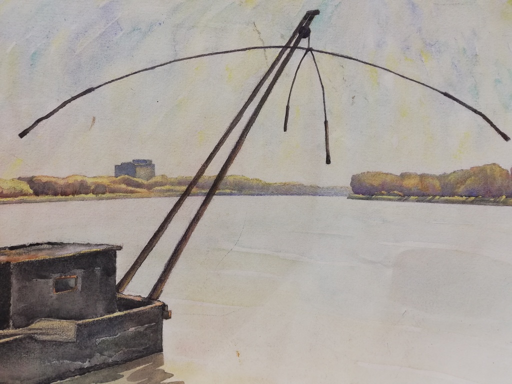 Darstellung: links im Vordergrund ein Boot, wahrscheinlich Fischerboot mit Halterung fürs Netz in Bildoberhälfte