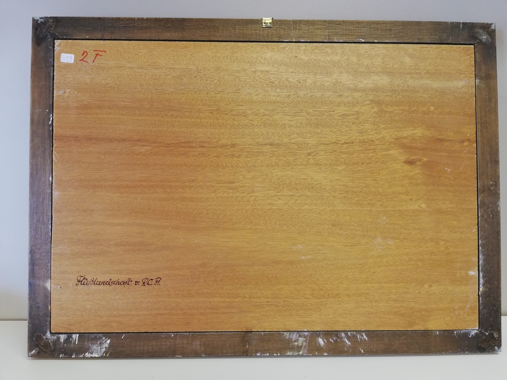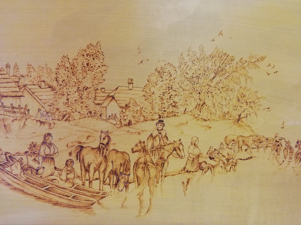 20. Jhdt. Vordergrund Leute und Pferde am Flussufer, Links unten 2 Boote Hintergrund Dorf im Wald