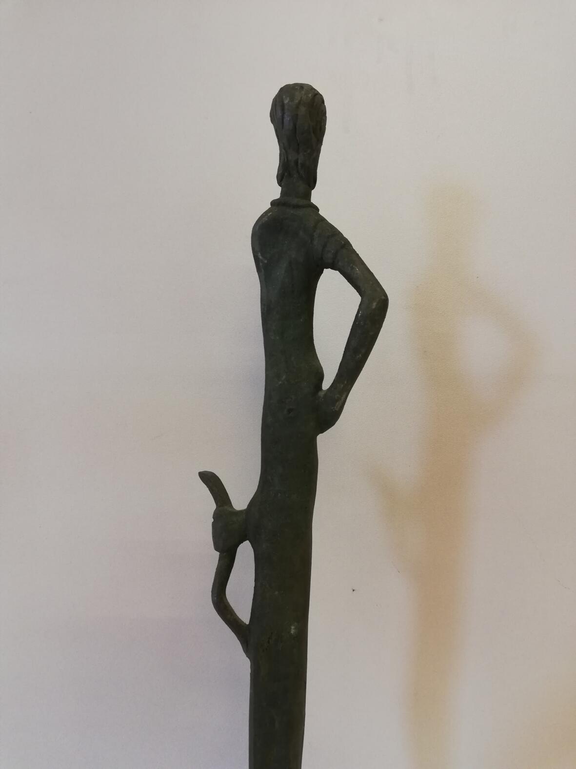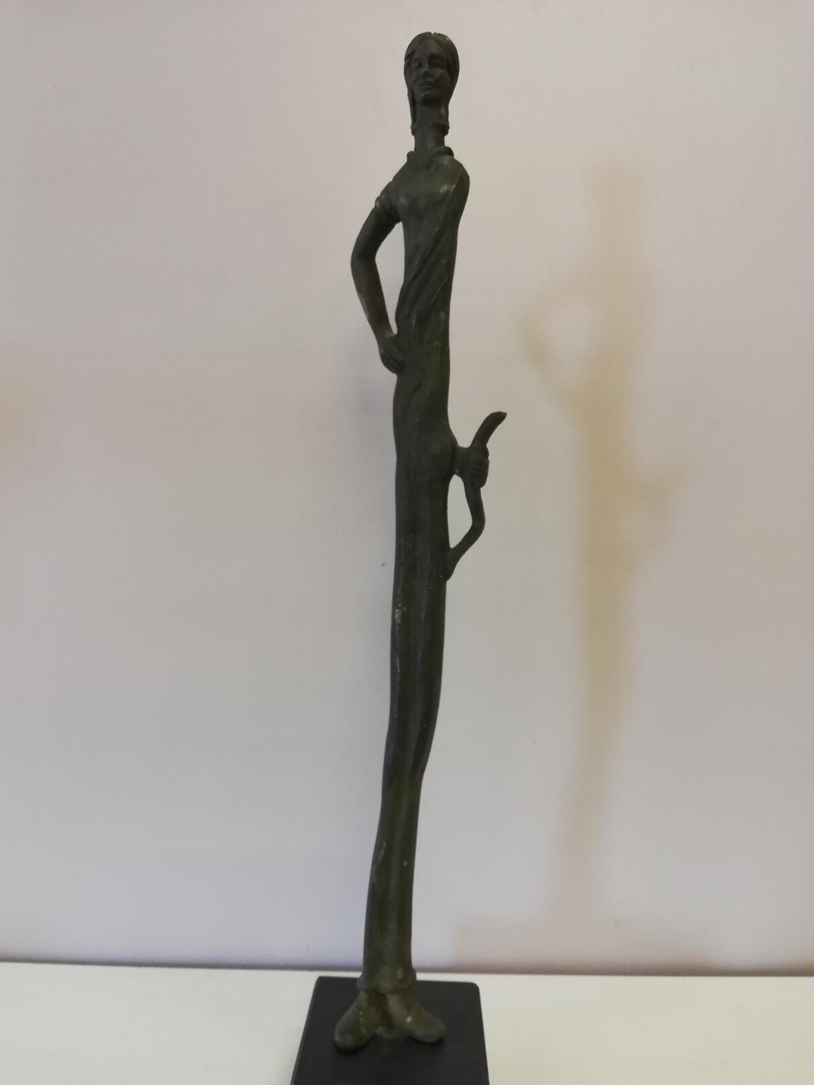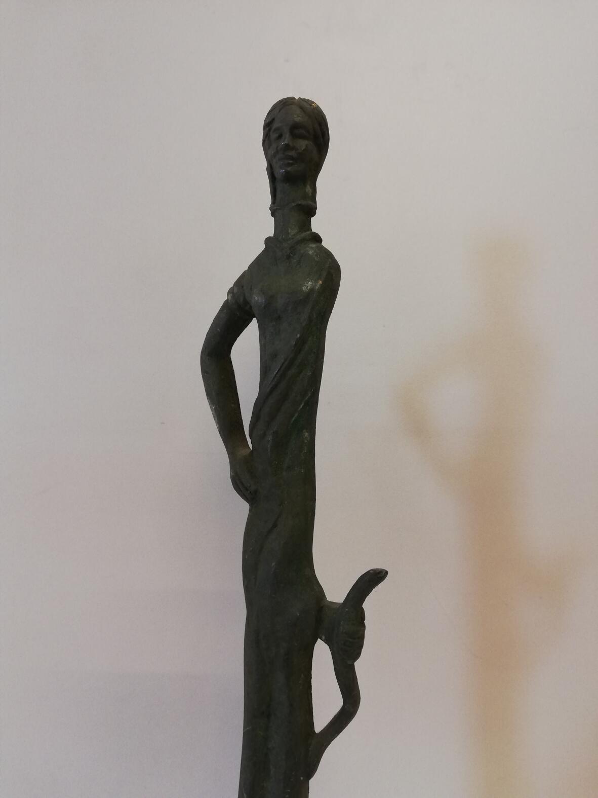 Darstellung: Sehr dünne Frau hält Schlange, rechter Arm in Hüfte gestützt,
