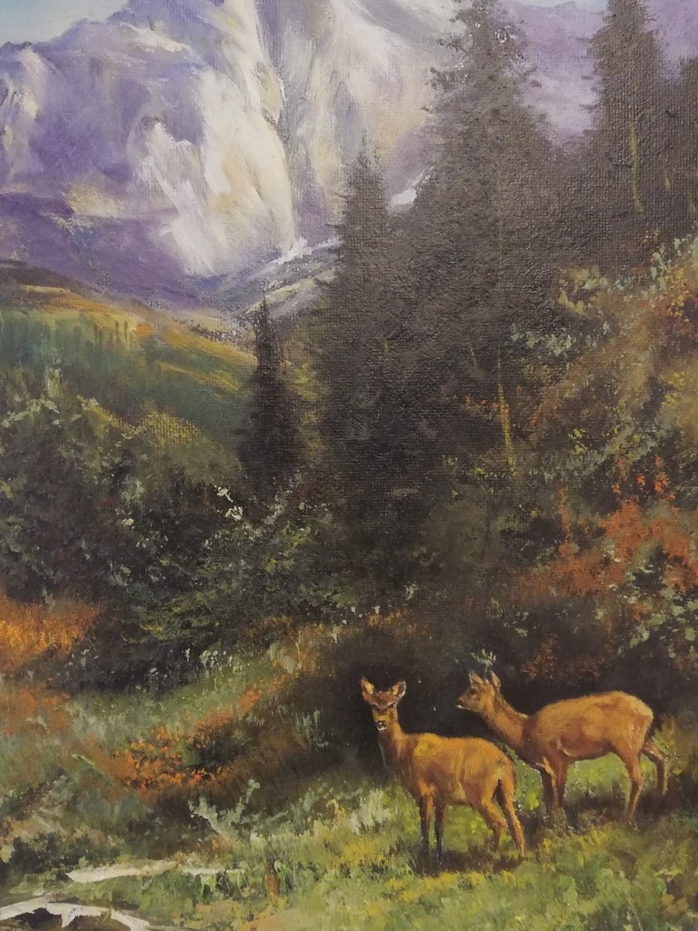 Motiv: rechts 2 Rehe, Wald, Gebirge im Hintergrund