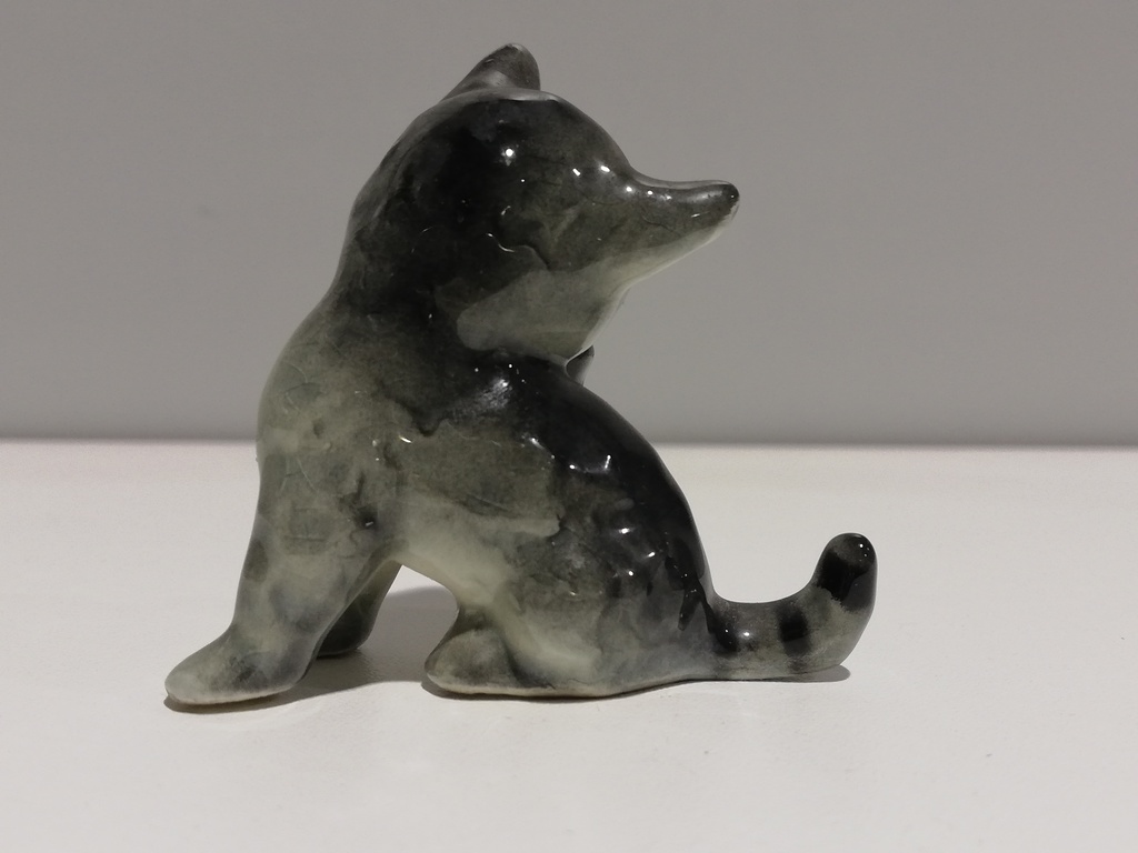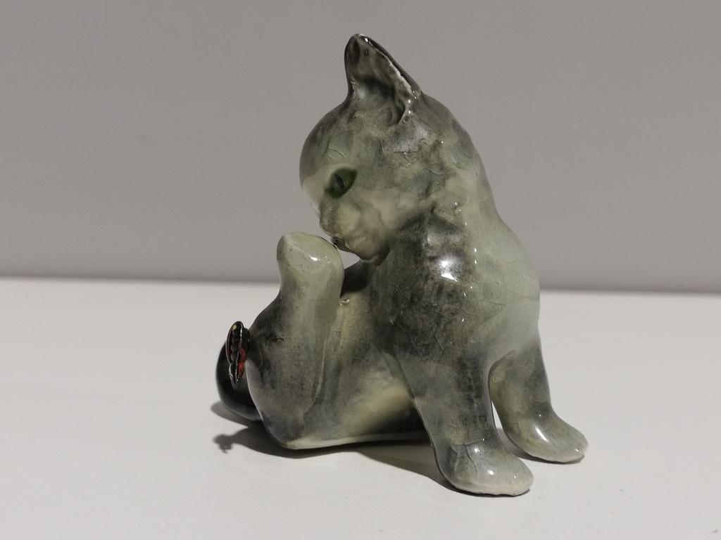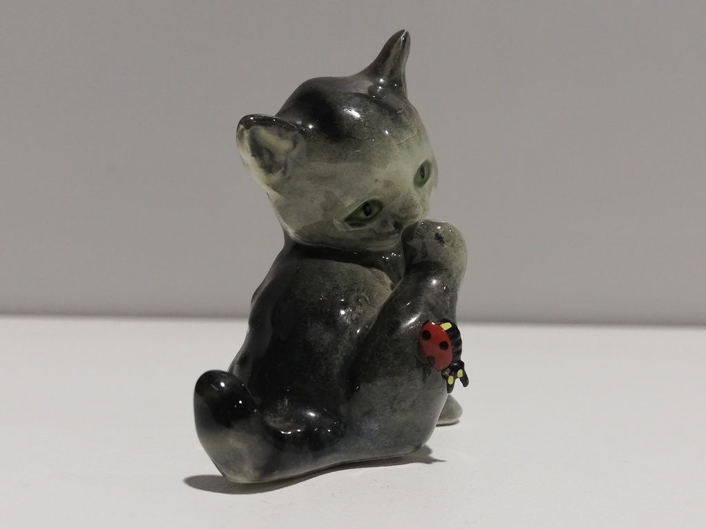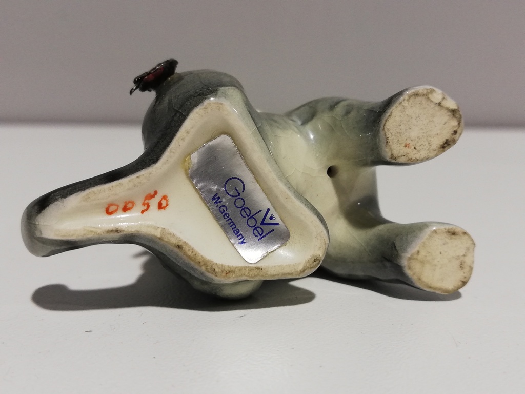 20.Jhdt. Aufkleber an Unterseite ,, V Goebel W.Germany " graues Fell, Marienkäfer auf dem Fuß, mit dem sie sich Nase putzt