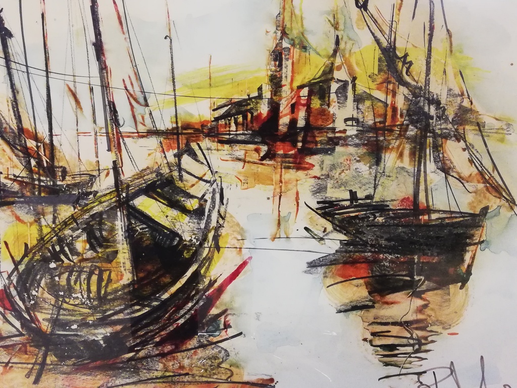 Motiv: Hafenszene mit Booten im Hintergrund Kirche