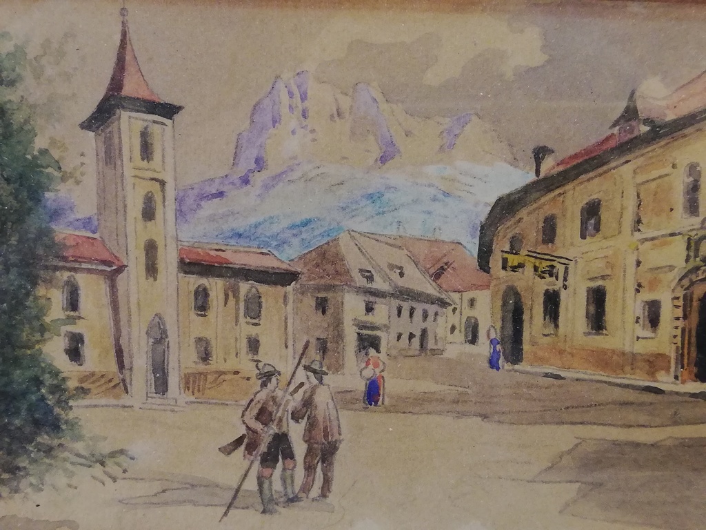 Motiv: im Hintergrund Berg, links Baum, Figurenstaffage