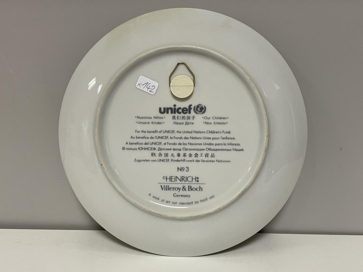 Signatur/Marke: auf der Vorderseite aufgedruckte Signatur "K. Blume"; laut grau aufgedruckter Beschriftung an der Rückseite: Nr. 3 aus der Tellerserie "Unsere Kinder" der "unicef", "Zugunsten von UNICEF, Kinderhilfswerk der Vereinten Nationen", Marke: ©HEINRICH: Villeroy & Boch Germany", "A work of art not intended for food use"