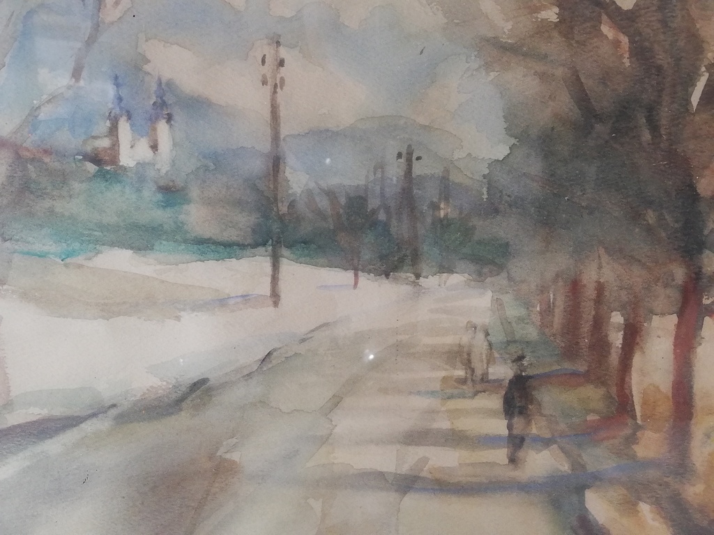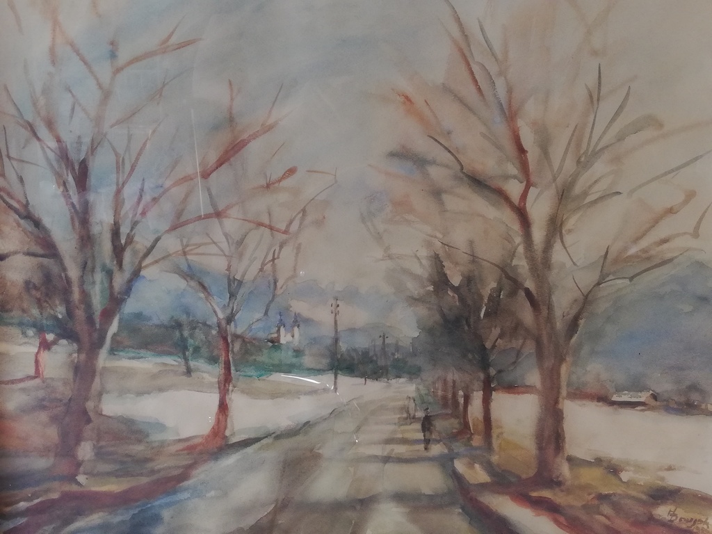 Motiv: Allee mit Kahlen Bäumen, Strommasten, links Hintergrund Kirche