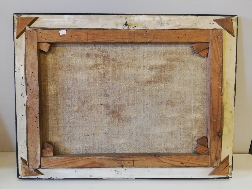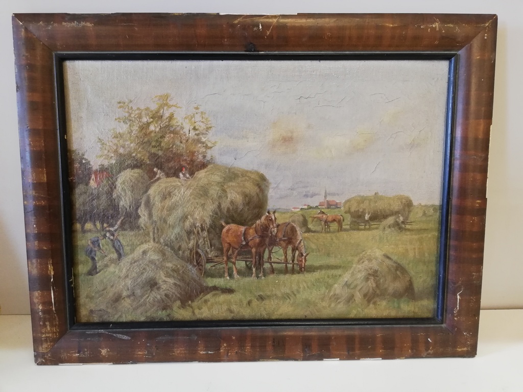 Motiv: links Bäume vor Haus, im Hintergrund Dorf
