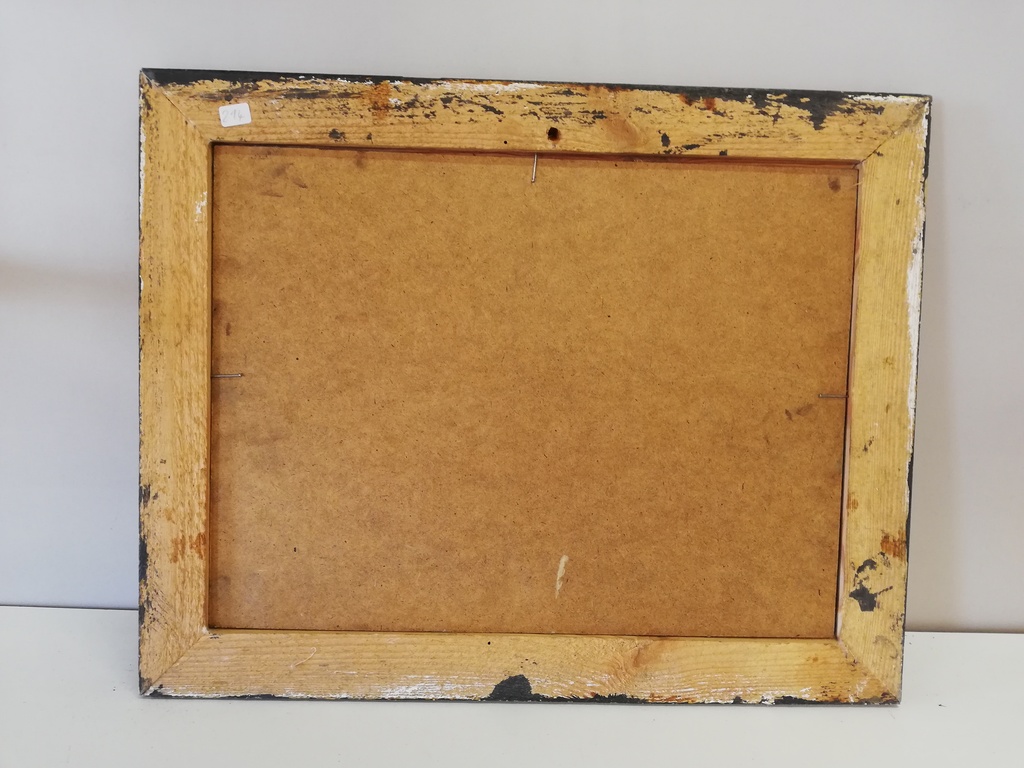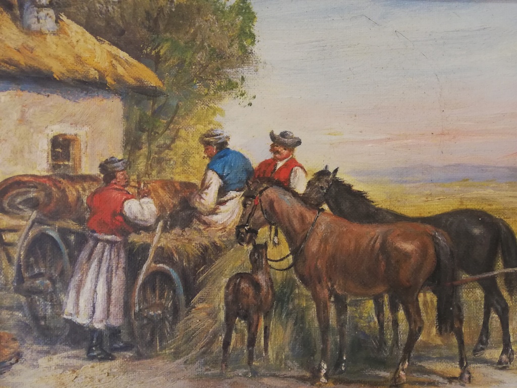 Motiv: vor einem strohgedeckten Bauernhof links ist Heuwagen, 3 Personen, rechts 2 Pferde und ein Pferdekind