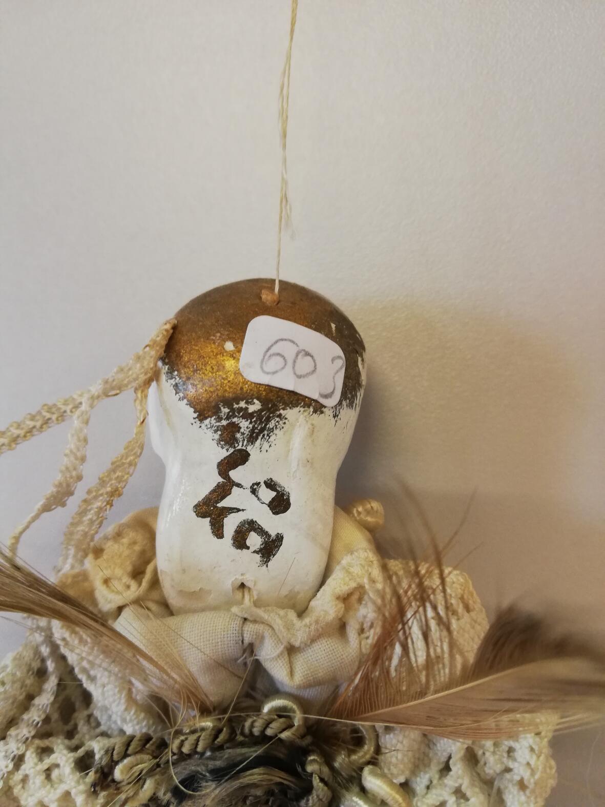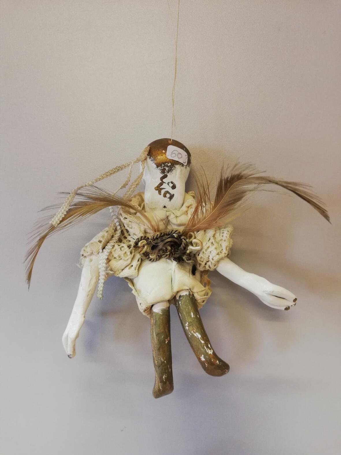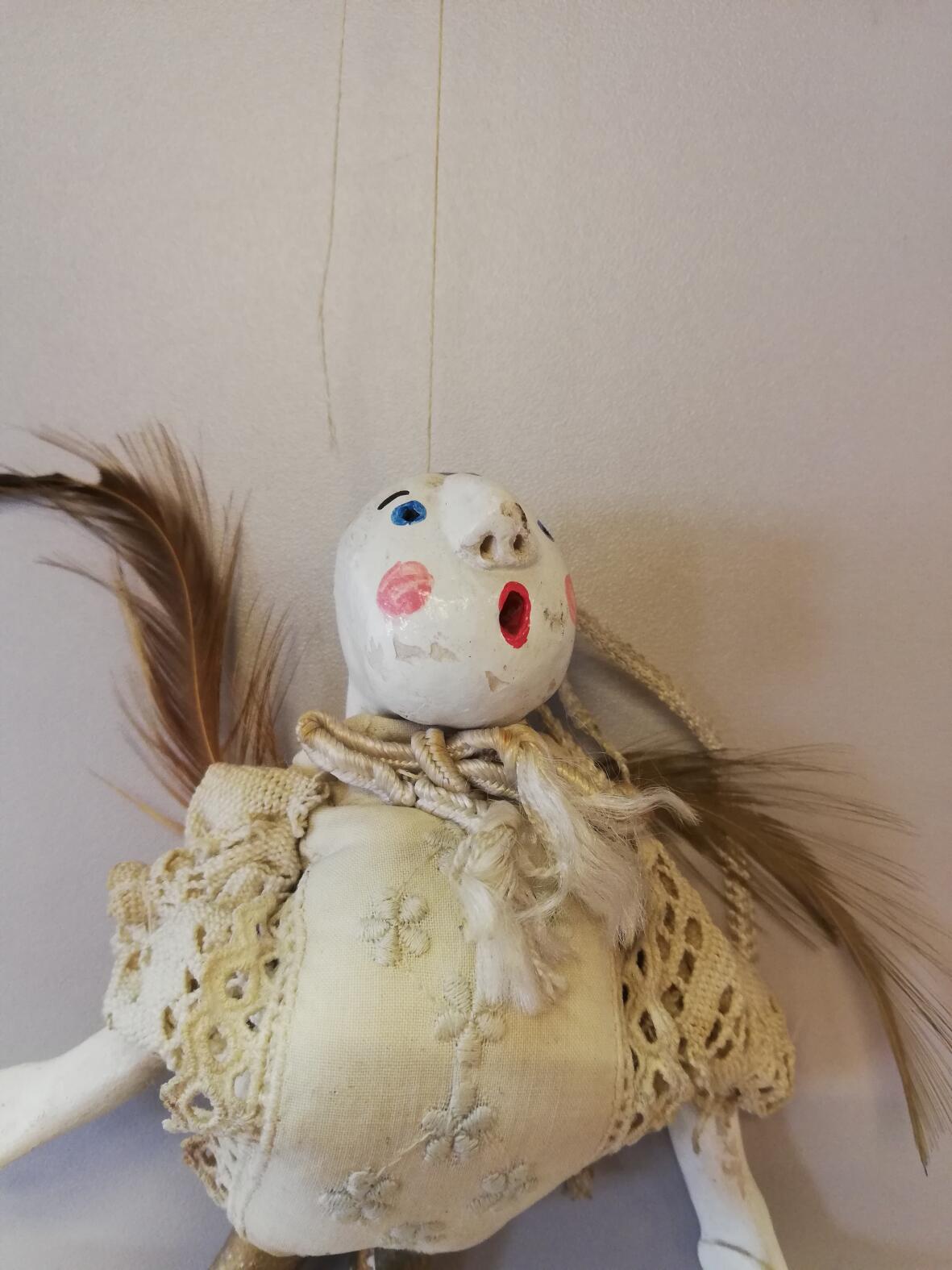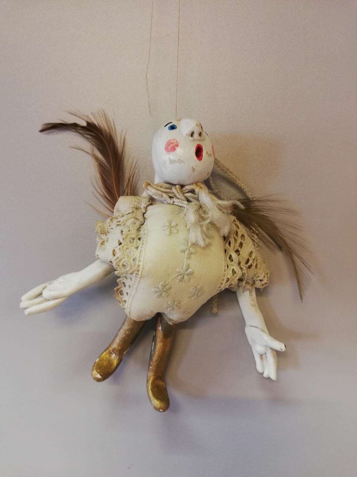 20.Jrhdt, Stoffkörper mit Armen, Beinen und Kopf aus Holz, große Nase, offener Mund,