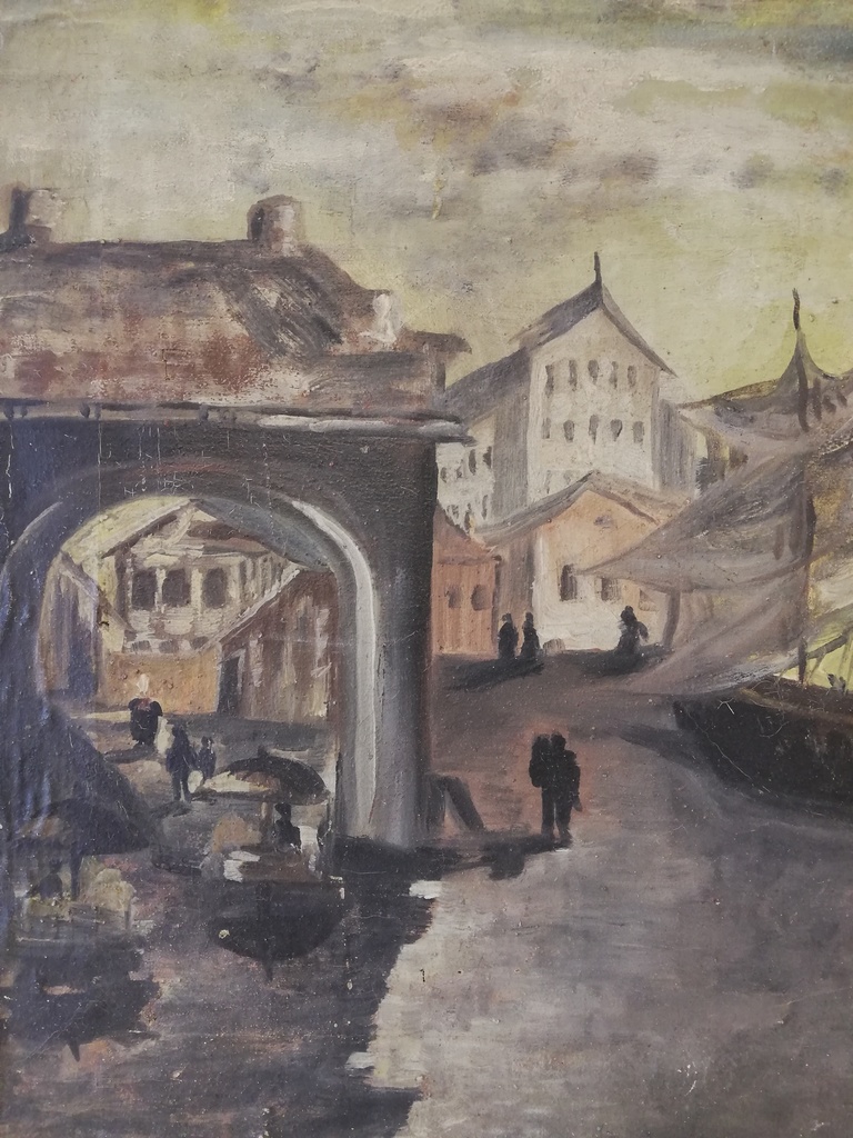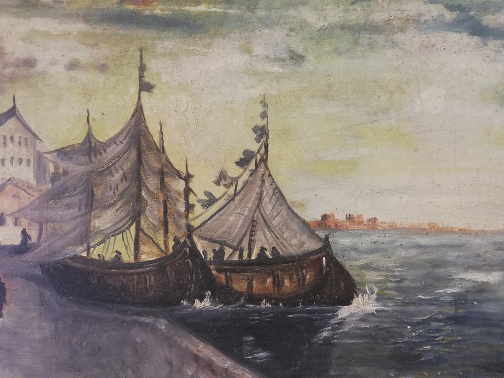 Motiv: links Tor, durch das Kanal führt, Hafen mit 2 Schiffen in Mitte, links im Hintergrund bauten