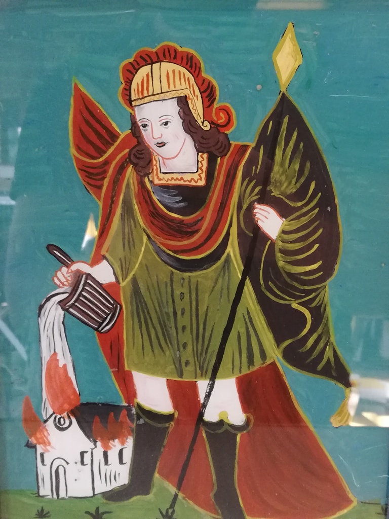 Motiv: Florian schüttet Wasser auf brennendes Haus