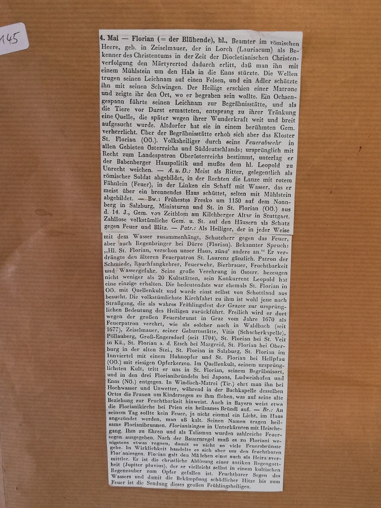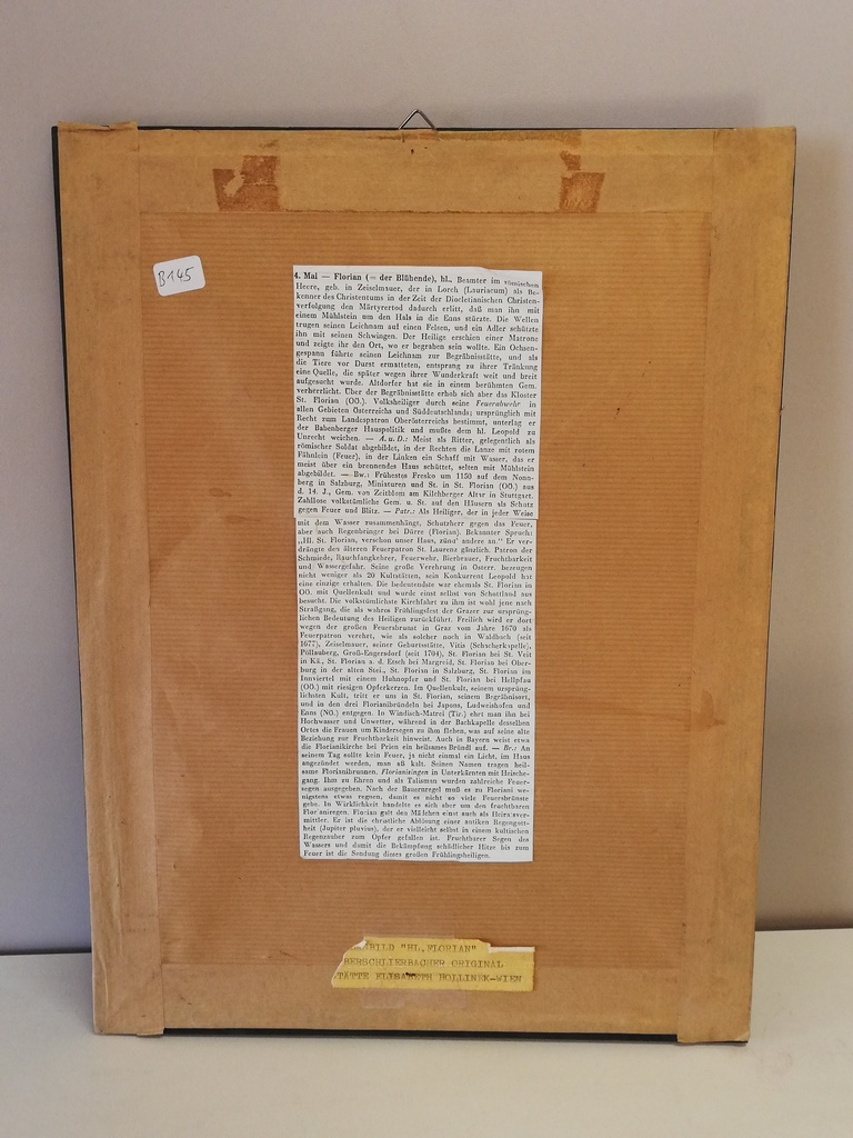 Aufkleber mit Maschinenschrift auf Rückseite (ergänzt) Hinterglasbild " HL.Florian " Oberschlierbacher Originalwerkstätte Elisabeth Hollinek-Wien "