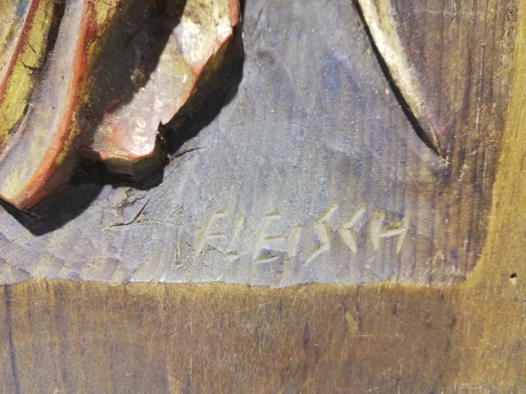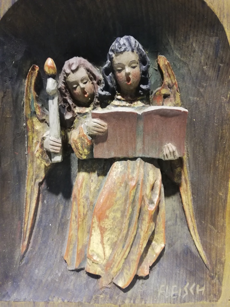 der linke hält eine Kerze, der rechte ein Buch, in das beide schauen und singen, handgeschnitzt, rechts unten signiert ,, FLEISCH,,