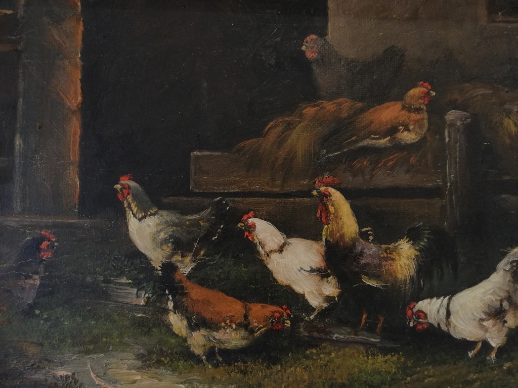 Motiv: mittig der Hahn, rundum die gackernden Hendln