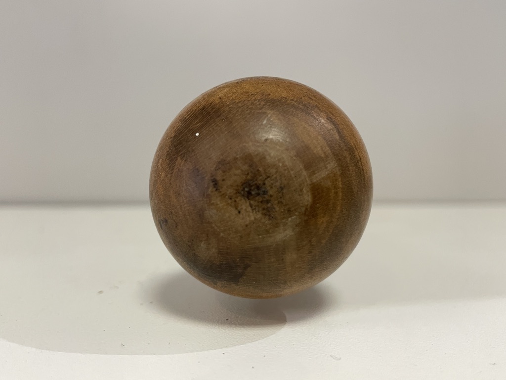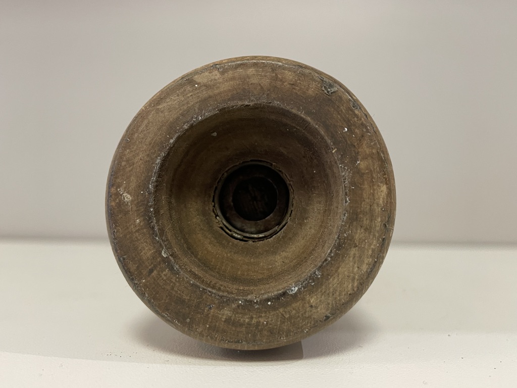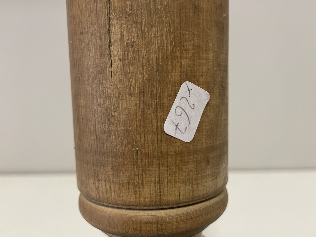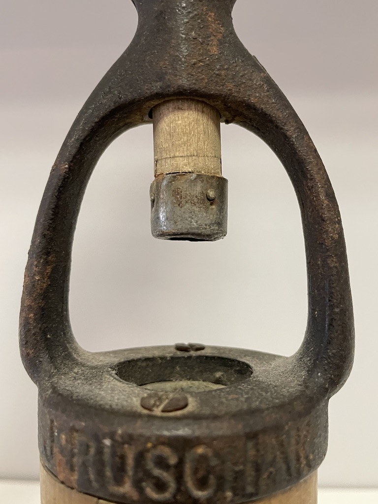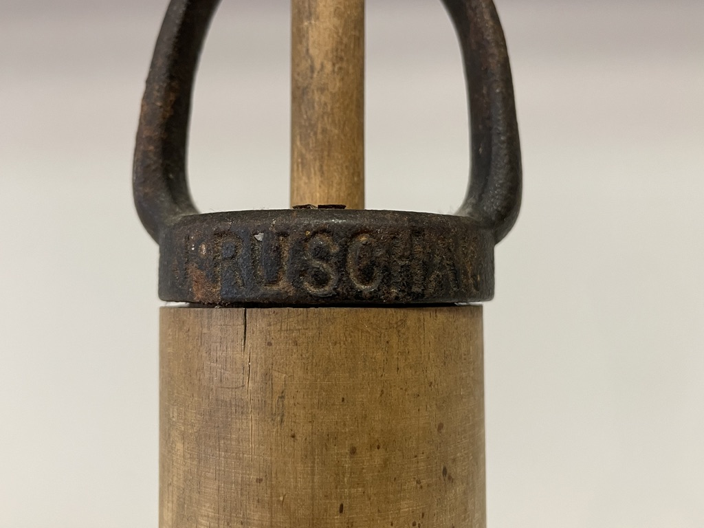 Hölzerner Stab steckt in Gusseisenhalterung, die auf zylindrischem Holzkörper sitzt, in dessen Loch der Holzstab eingeschoben wird