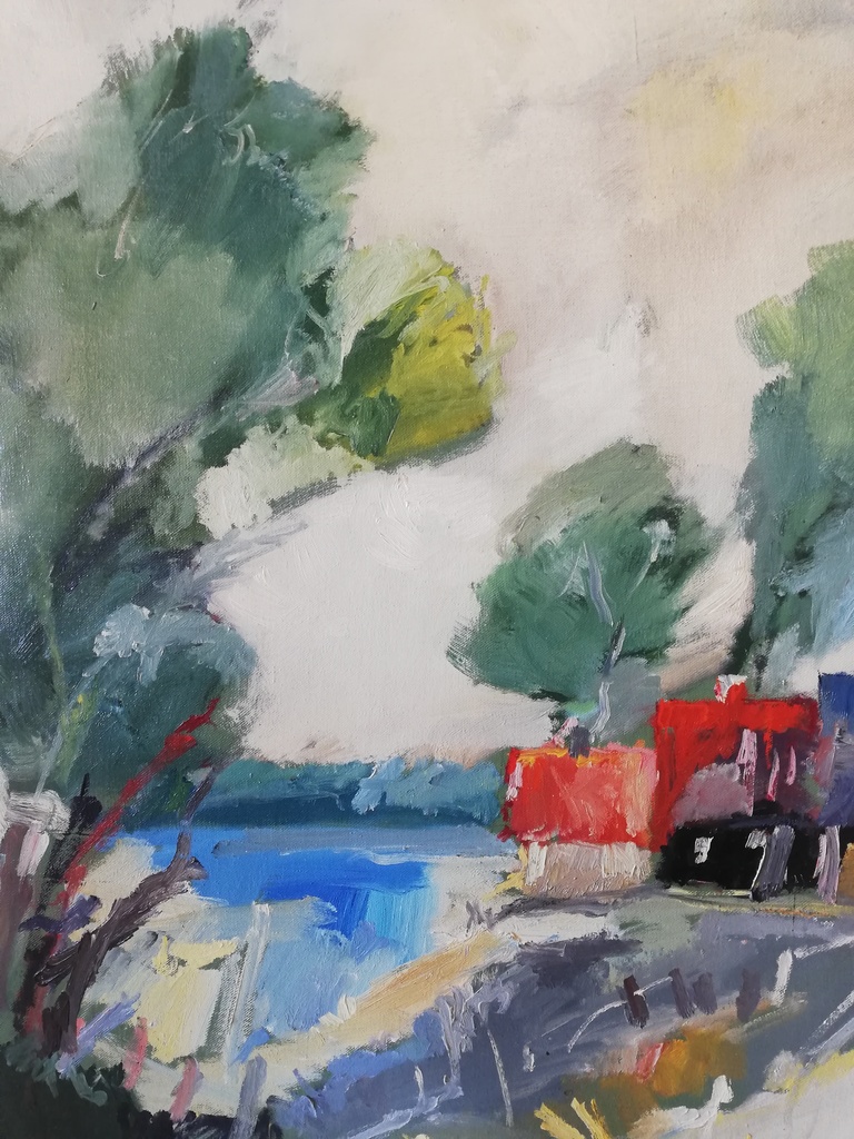 20.Jhdt. Jozef Krzempek ,, NAD NARWIA " , Gewässerlandschaft mit Bäumen und rechts Dorf