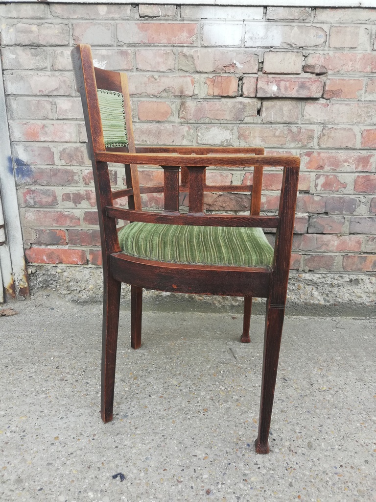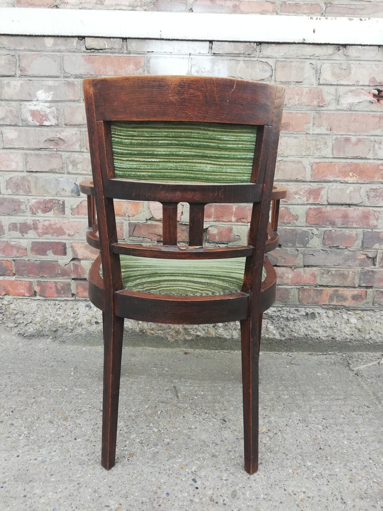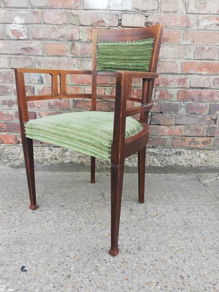 Jugendstil Armlehnstuhl um 1900-1910, Schellack politiert, grünem Streifenbezug,
