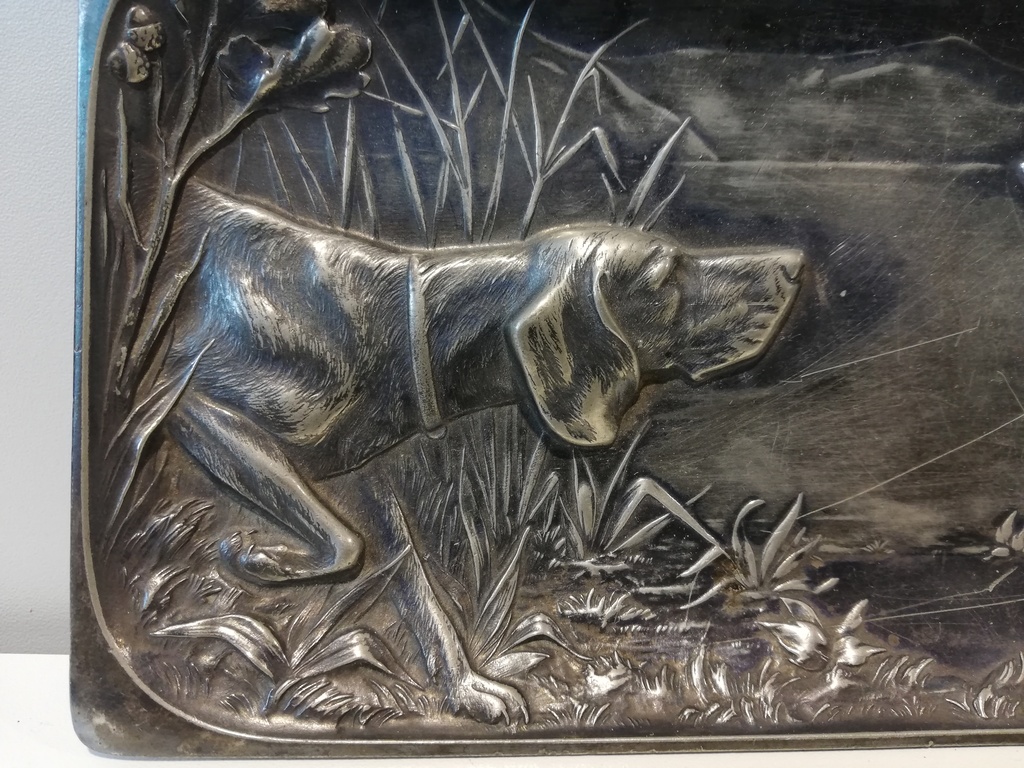 20.Jhdt. versilbertes Metall, Relief Hund vor Wasserpflanzen am Seeufer, rechts Baum, mittig See, dahinter Gebirge,