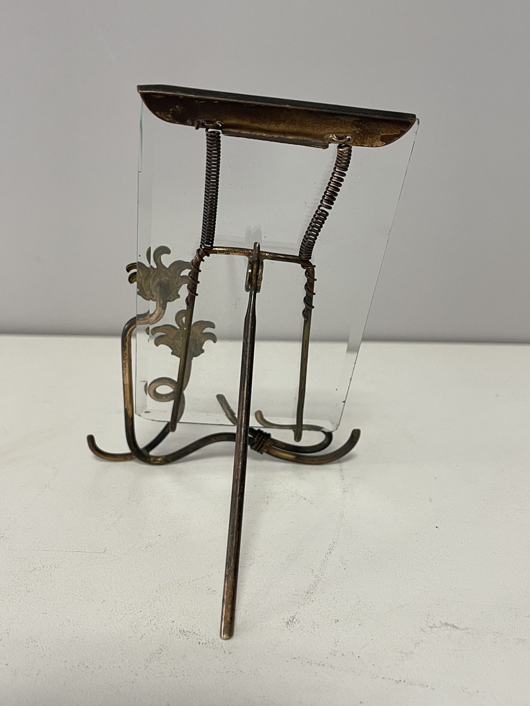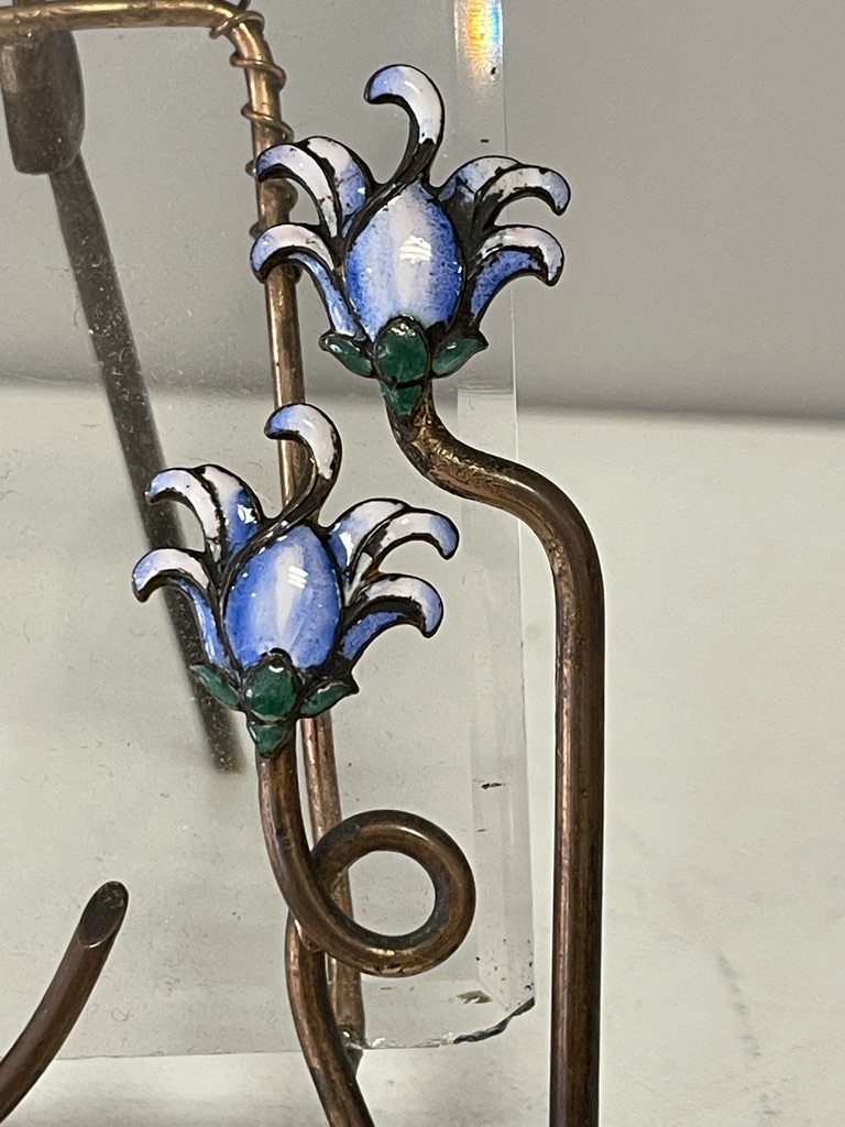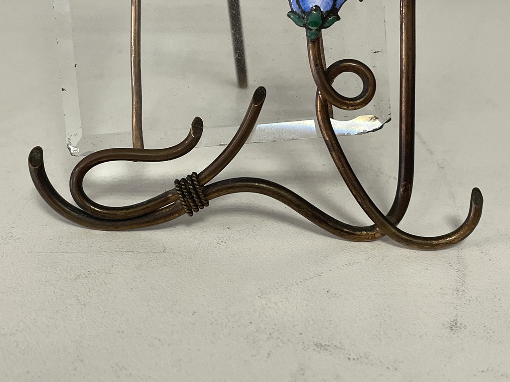 Gestell aus Kupferdraht mit 2 emaillierten Blüten; darin eingestellt fassettierte Glasscheibe