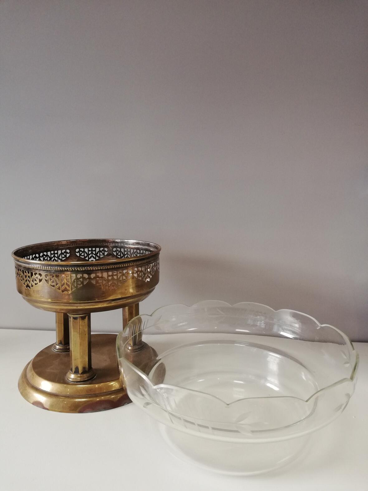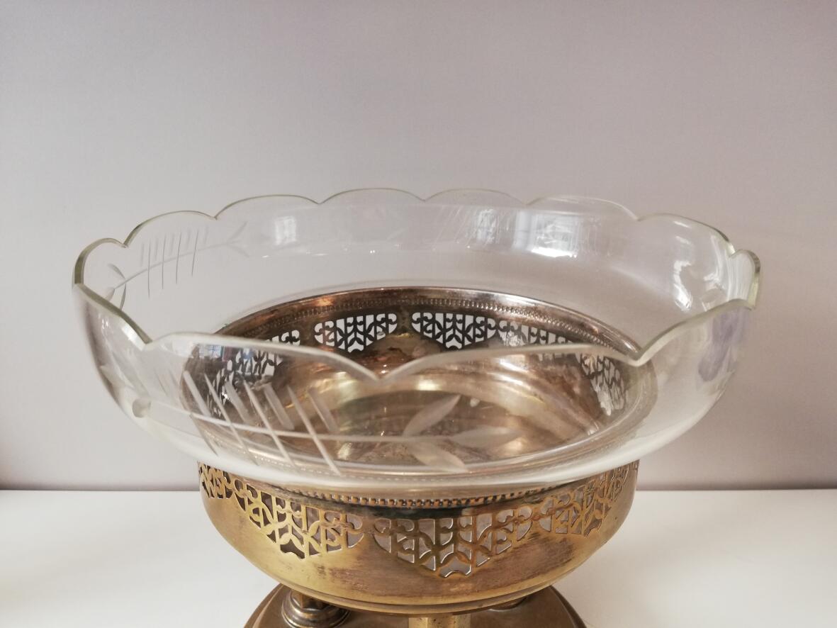 um 1910 , dreifüßiger Messingsockel mit durchbrochener Schale, versilbert Einsatzschale mit Schliffdekor