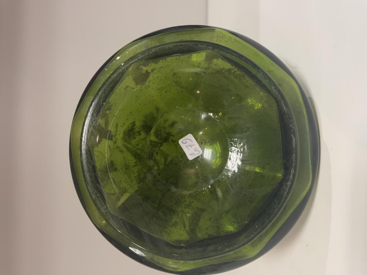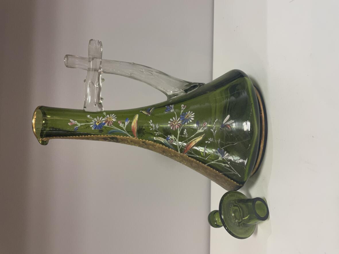 grüner Glas, astförmiger entfärbter Henkel, florale Emailmalerei, schräg darunterlaufendes vergoldetes Band