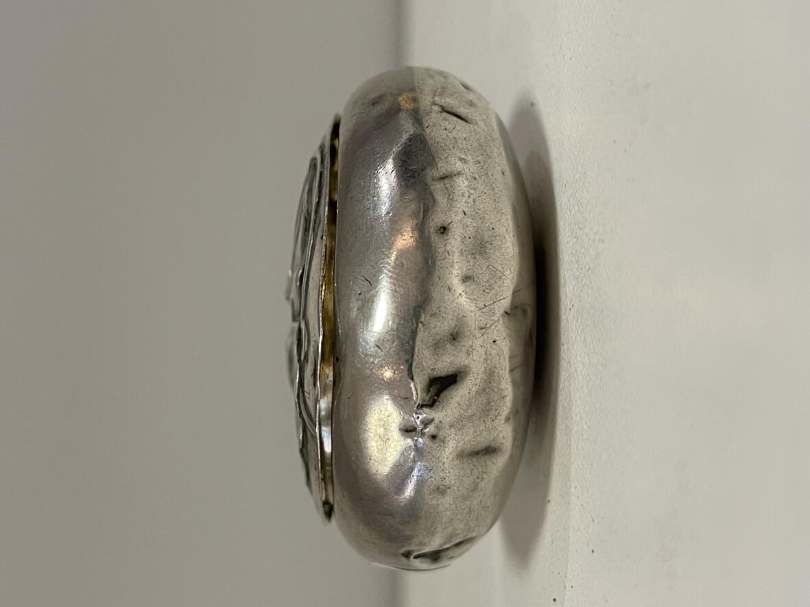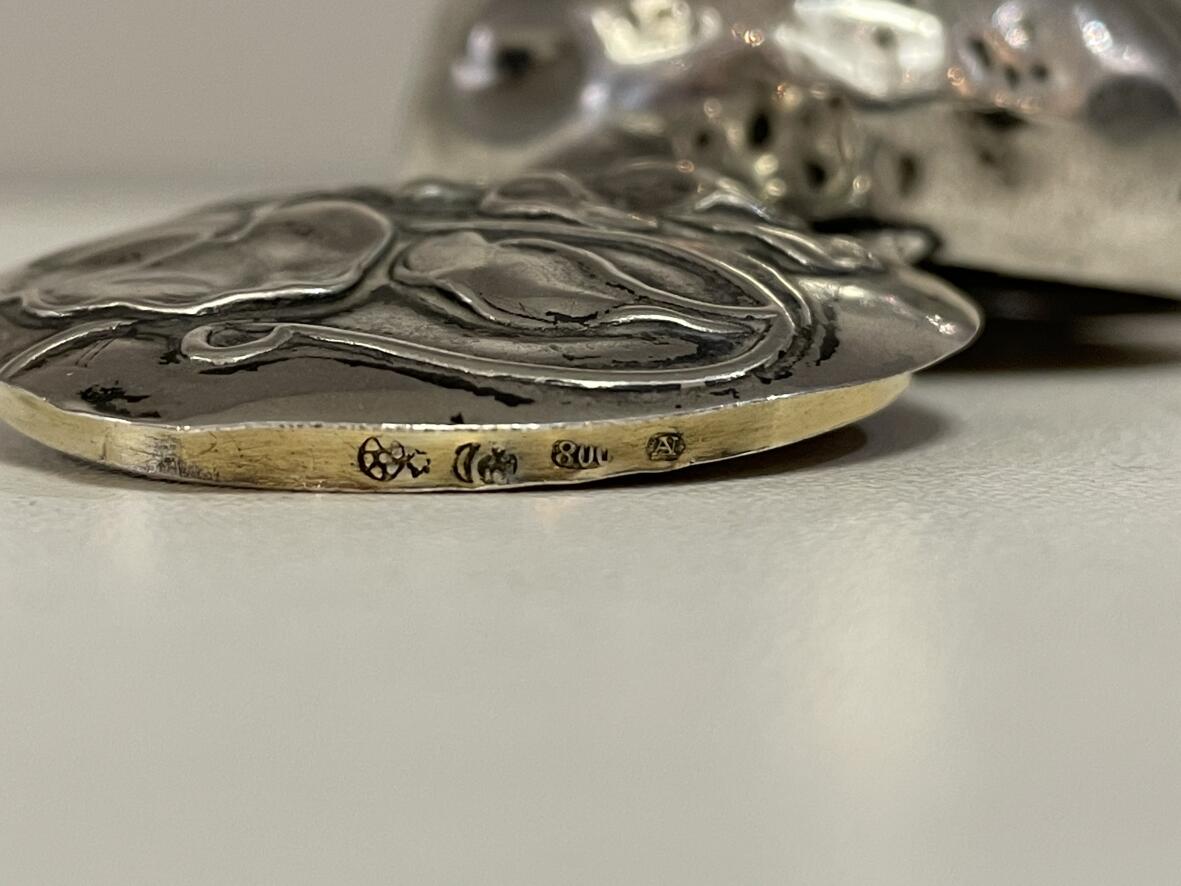 Punzen am Rand des Klappdeckels Halbmond und Krone für Silber in deutsch. ab 1888 ,, 800 " für 800er -Silber , Rosettenförmige Punze, Importpunze für Österreich bis 1902