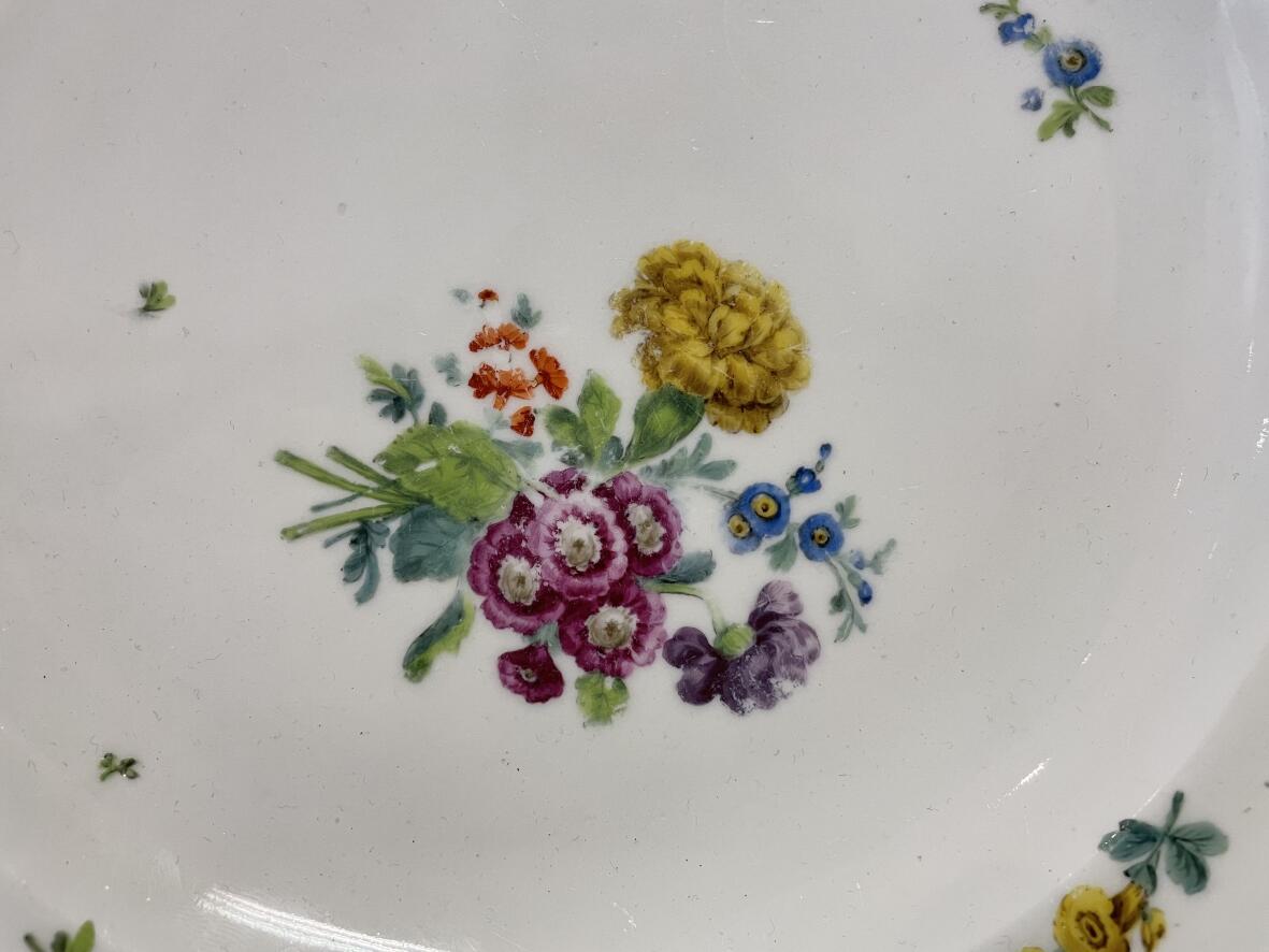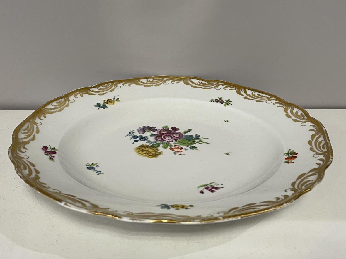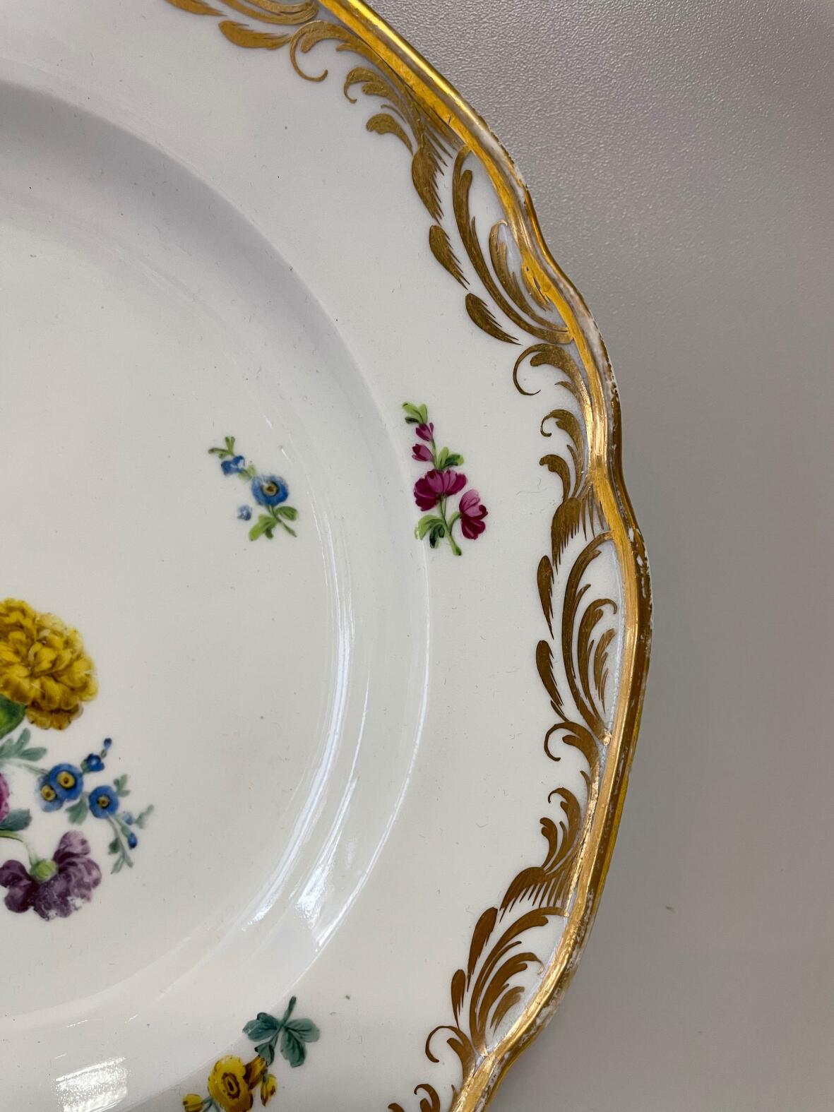 Speiseteller/Ragoutteller, Blumenmalerei in sehr guter Qualität, rundum Rokokobordüre gemalt in feinem Poliergold
