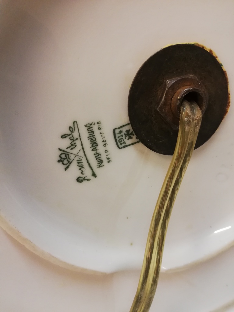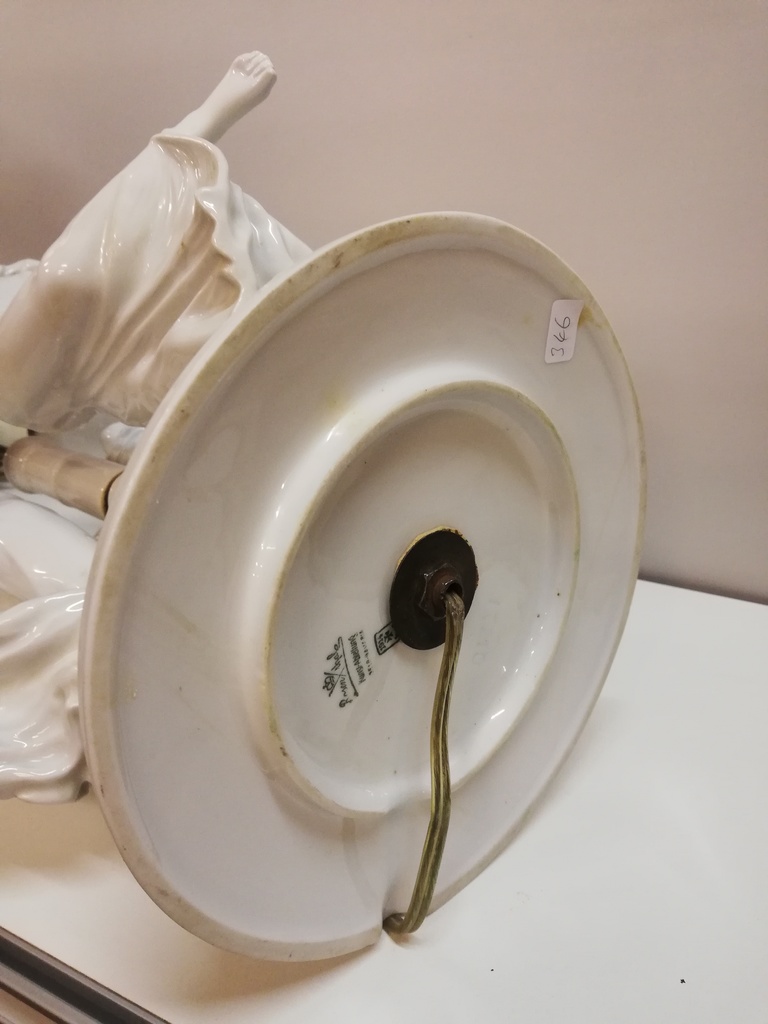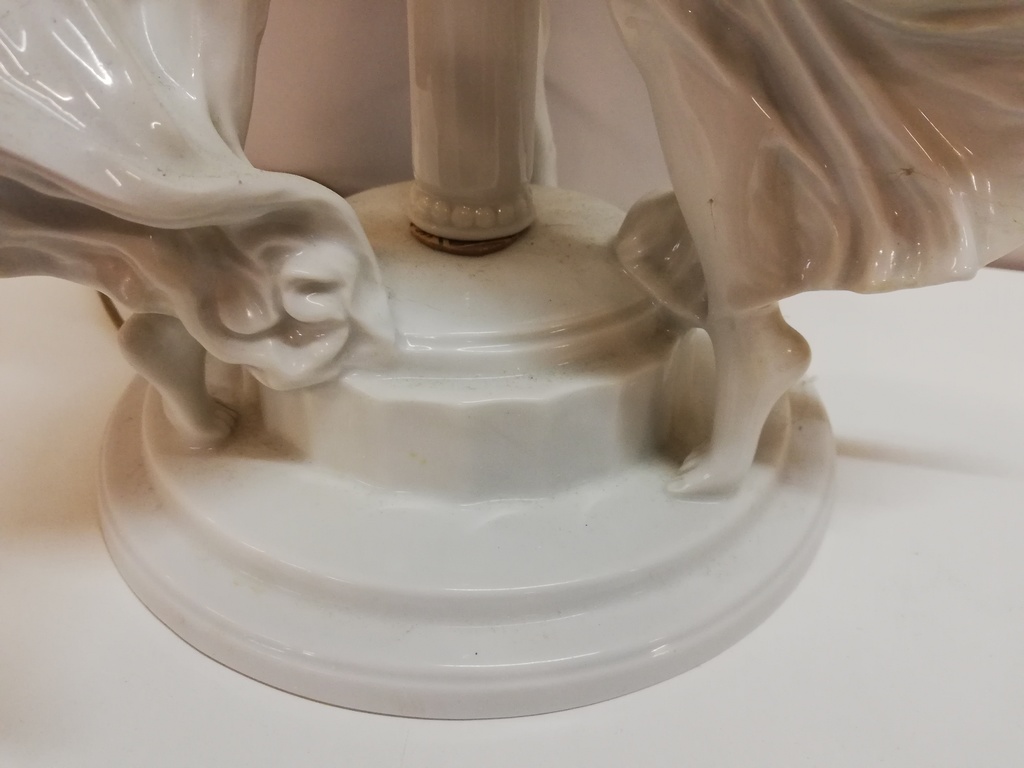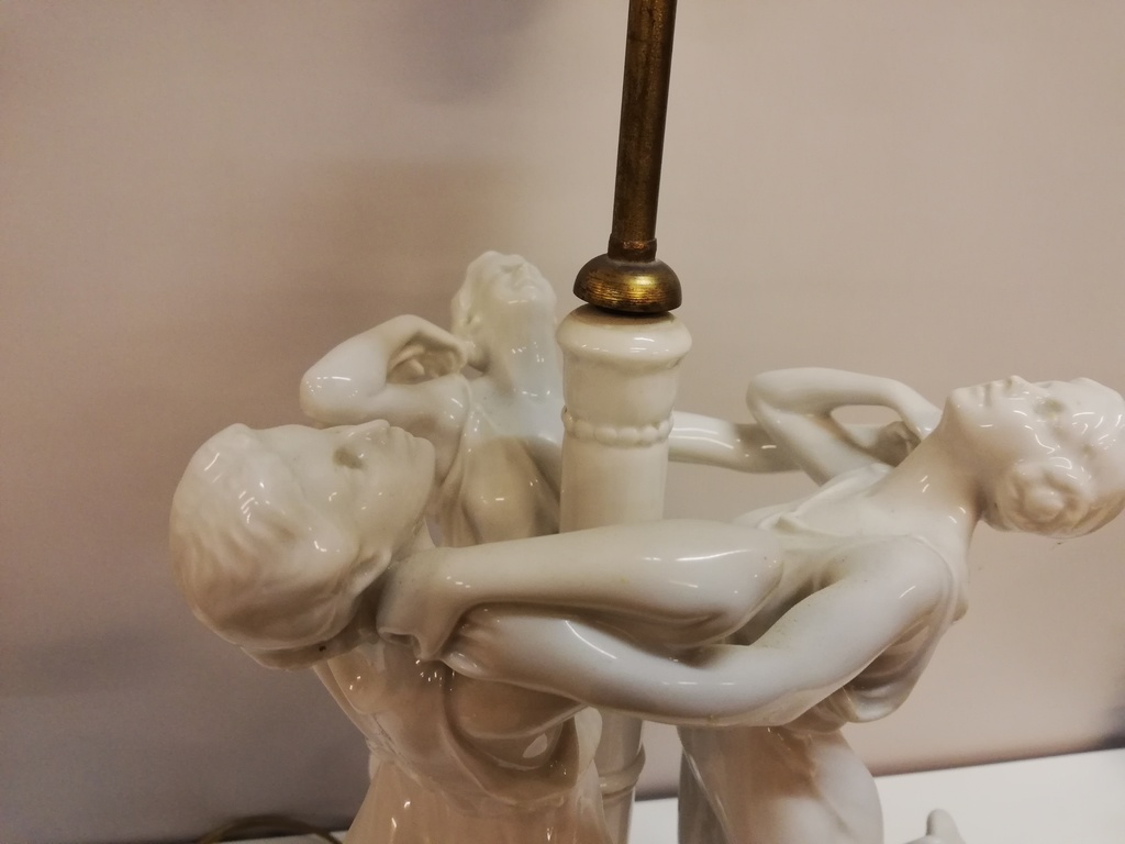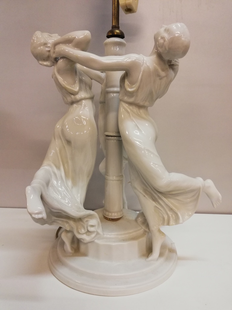 Tischlampe mit Lampenfuß der Figurengruppe "Festreigen", Entwurf Karl Himmelstoß 1913, Ausführung Rosenthal, Weißporzellan, drei tanzende Mädchen / Grazien in langen Gewändern auf getrepptem, profiliertem und kanneliertem Rundsockel, auf dem Sockel signiert (geprägt) "K. Himmelstoss" in Majuskeln, im Boden grüner Farbstempel unter Glasur "Rosenthal Germany Kunstabteilung Selb", Marke von 1939, weiterhin geprägte Modell-Nr.: K 210, , sehr guter und unbeschädigter Zustand ( Schirm fehlt )