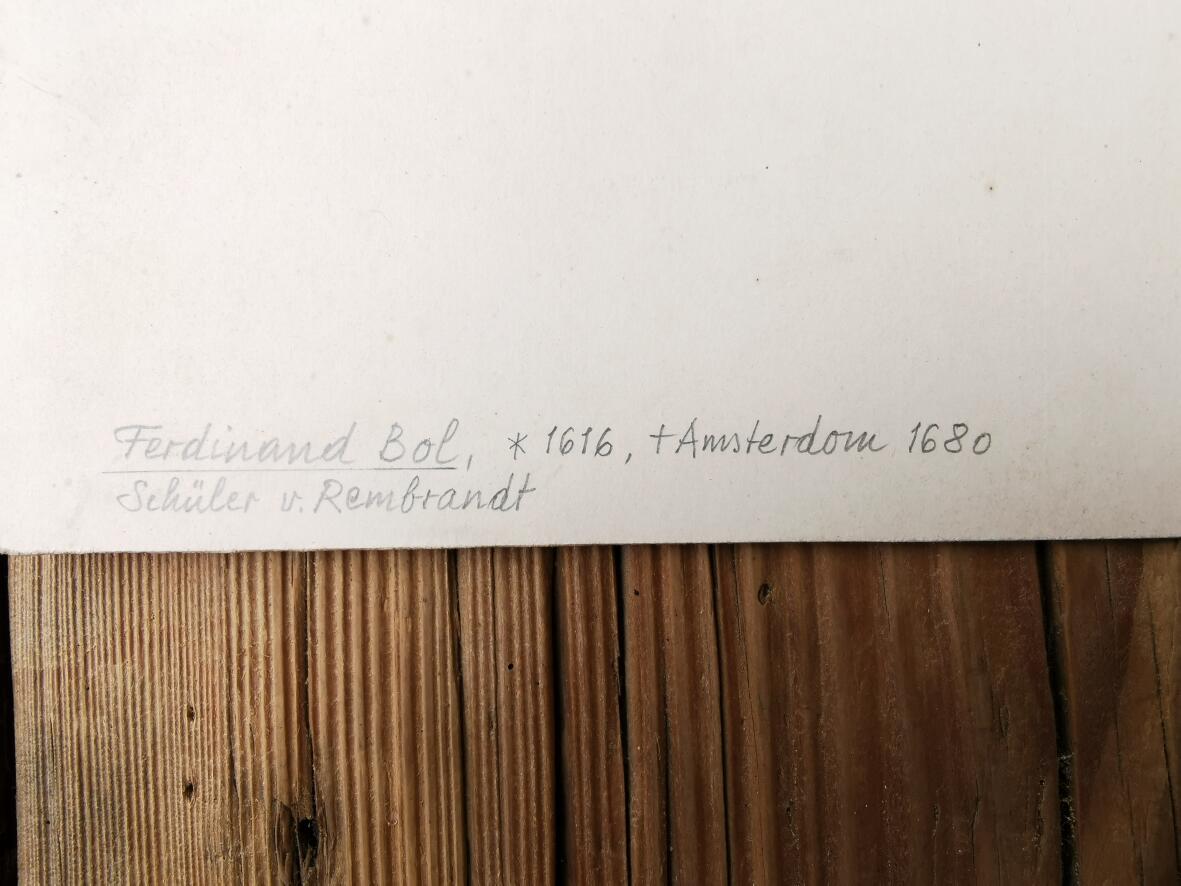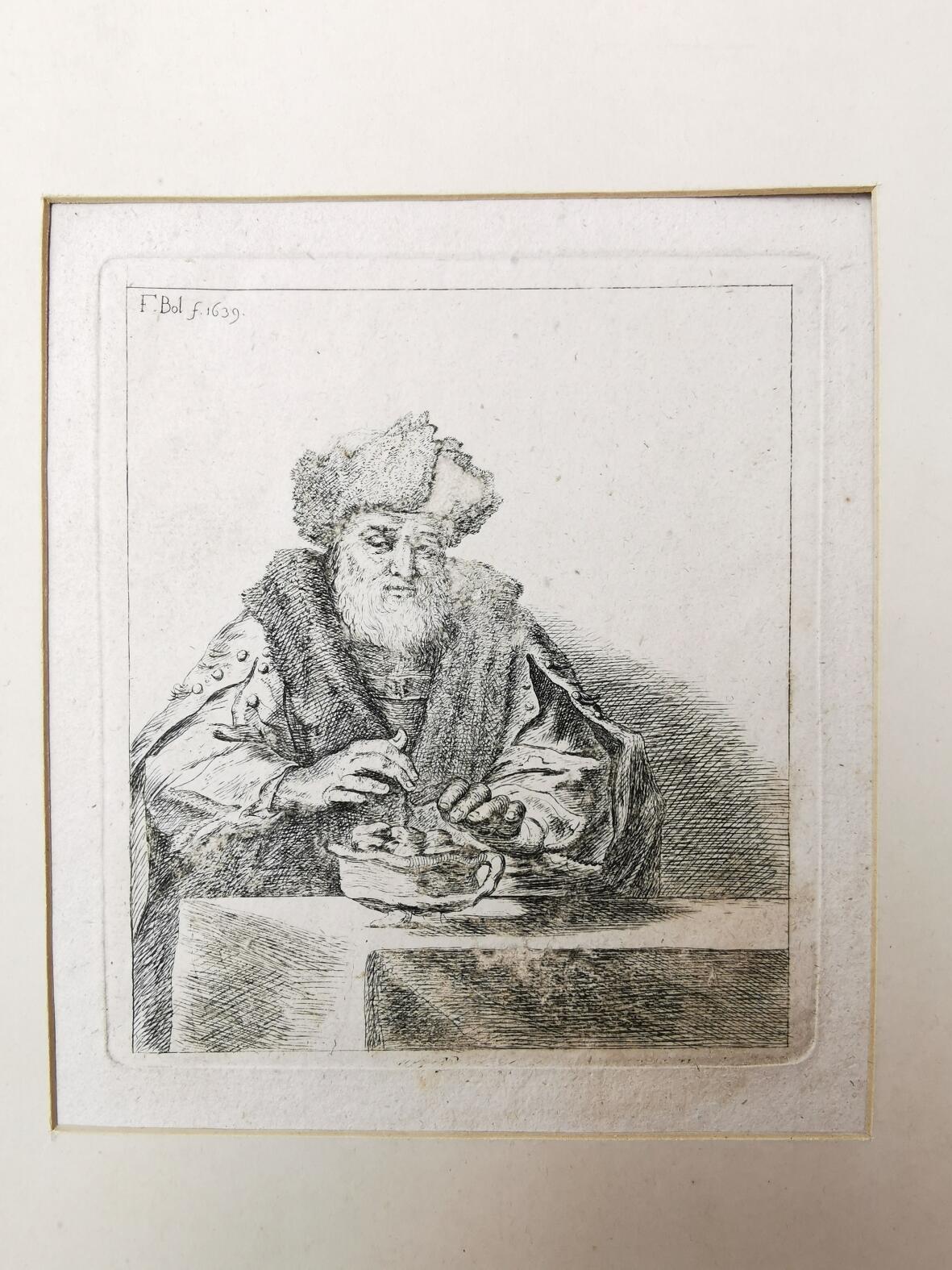 Darstellung eines alten Mannes vor Schüssel mit Hut