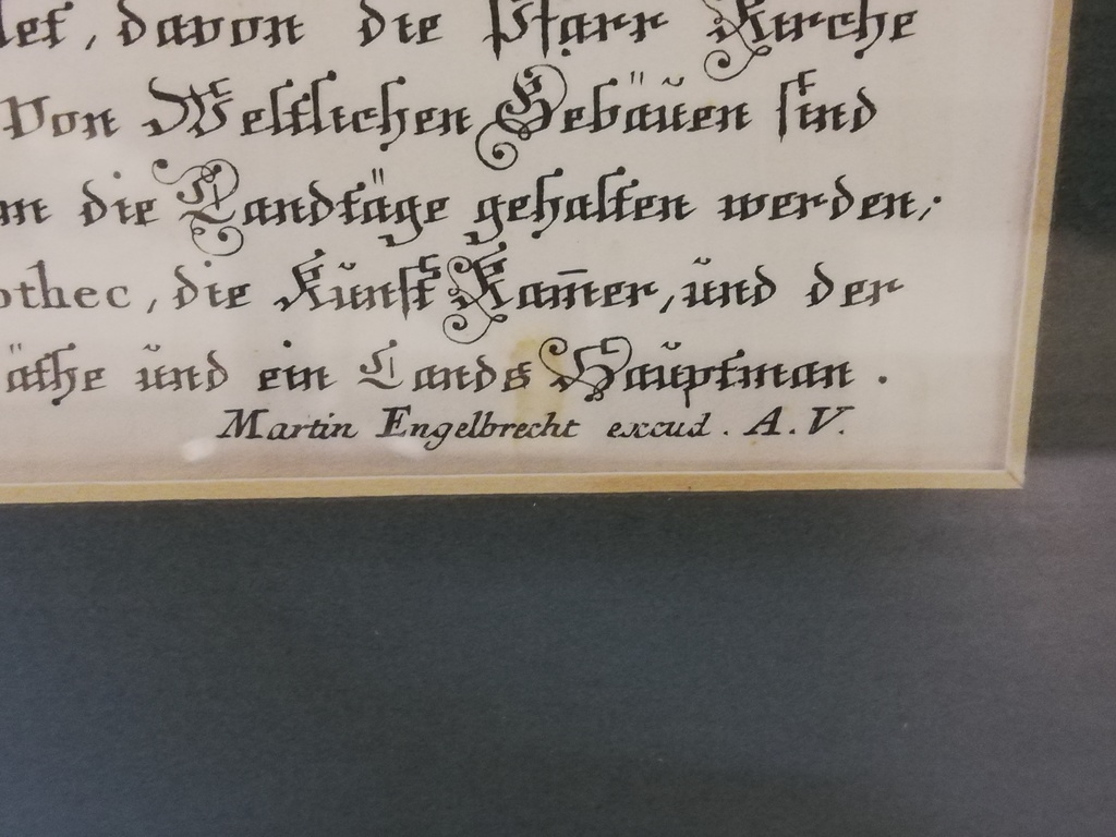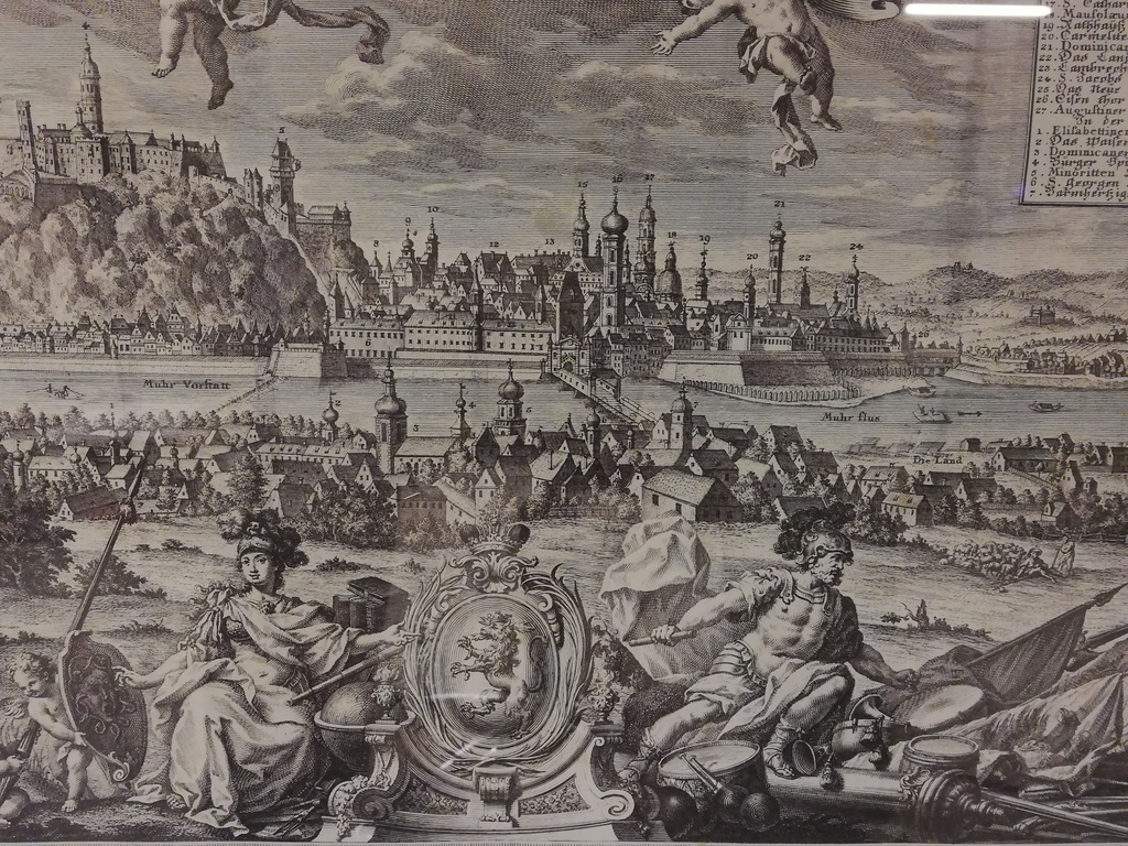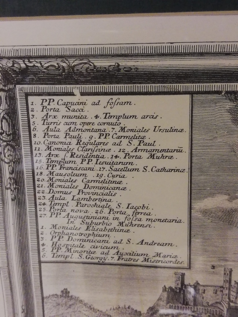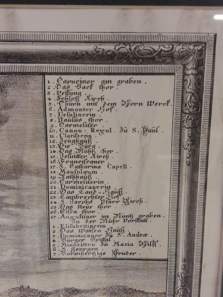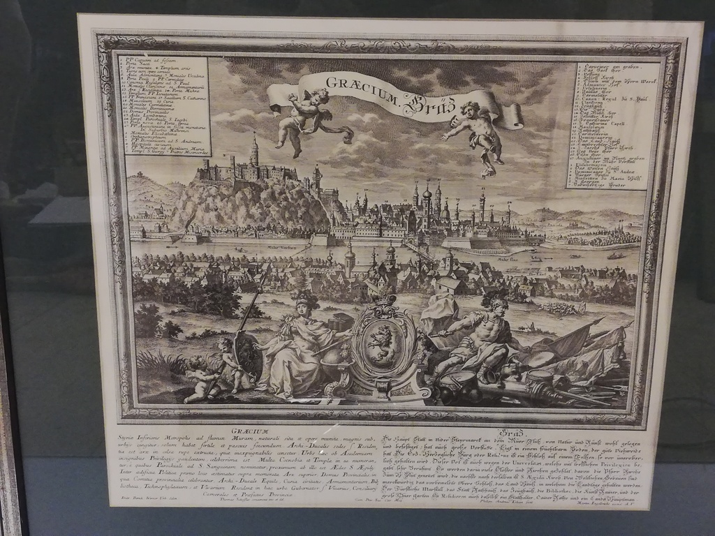 links und rechts oben Zahlen mit Beschriftungen der Gebäude unten links und rechts kurze Beschreibung von Graz in Latein links, in Deutsch rechts