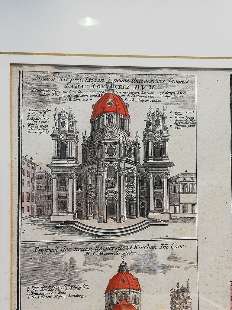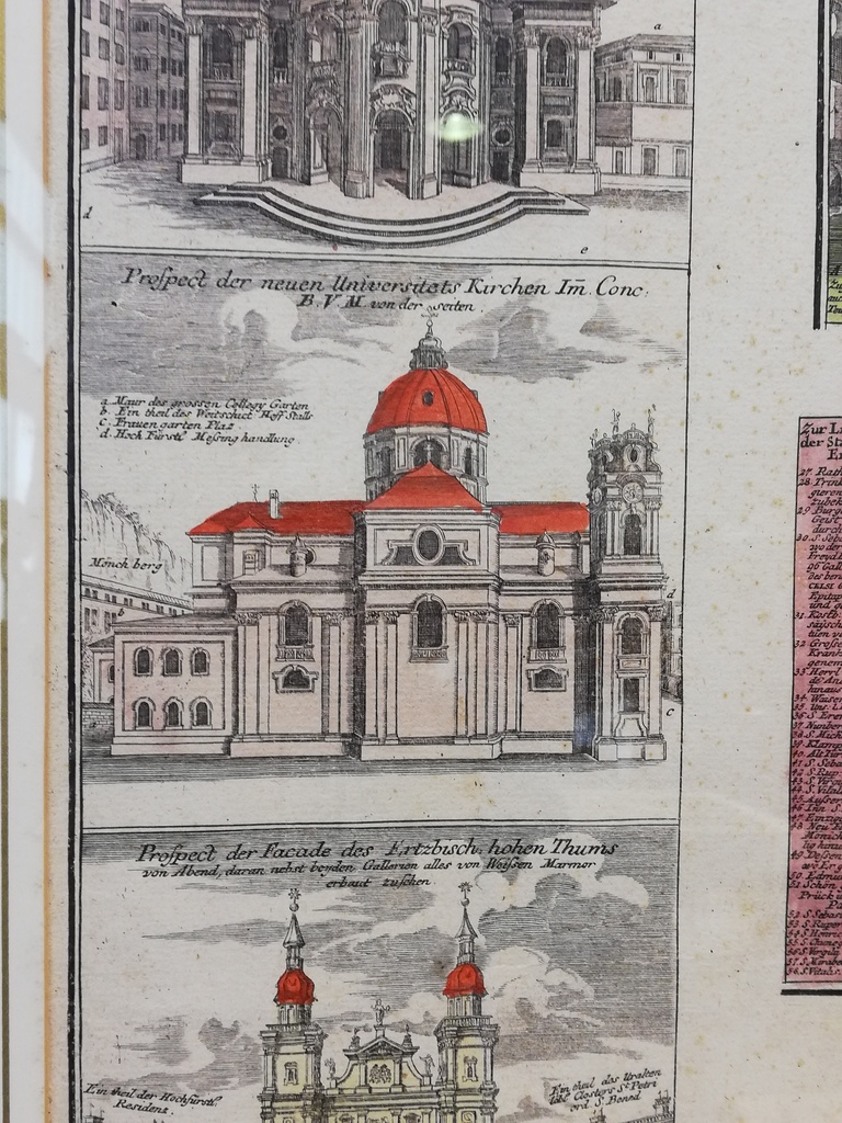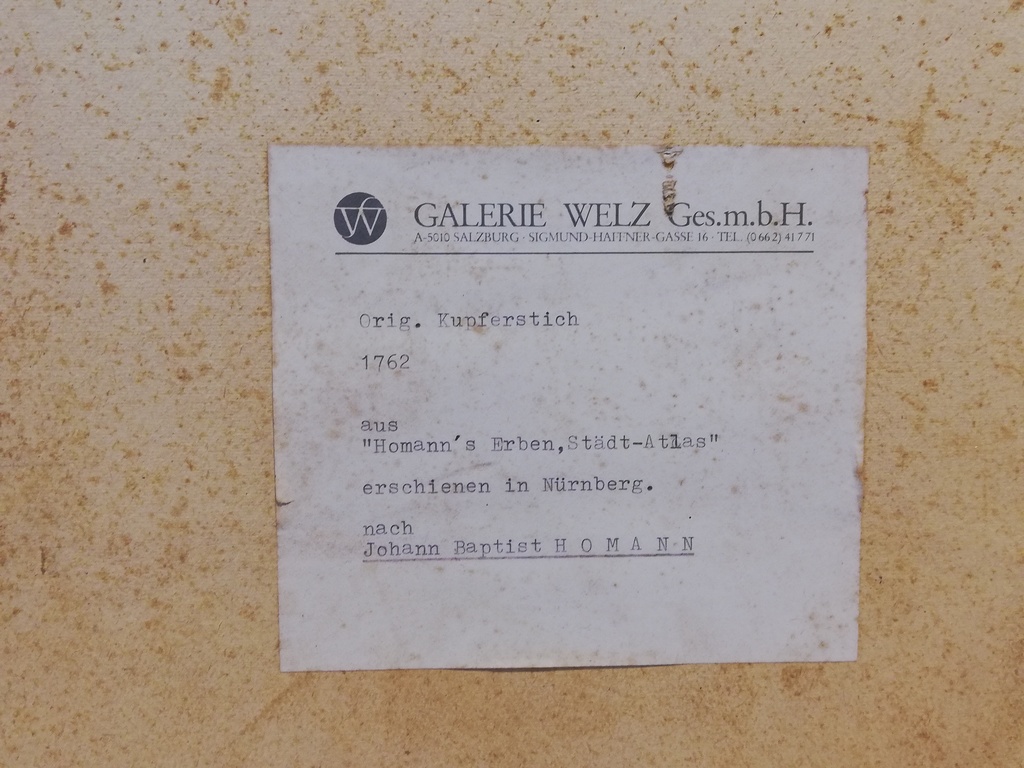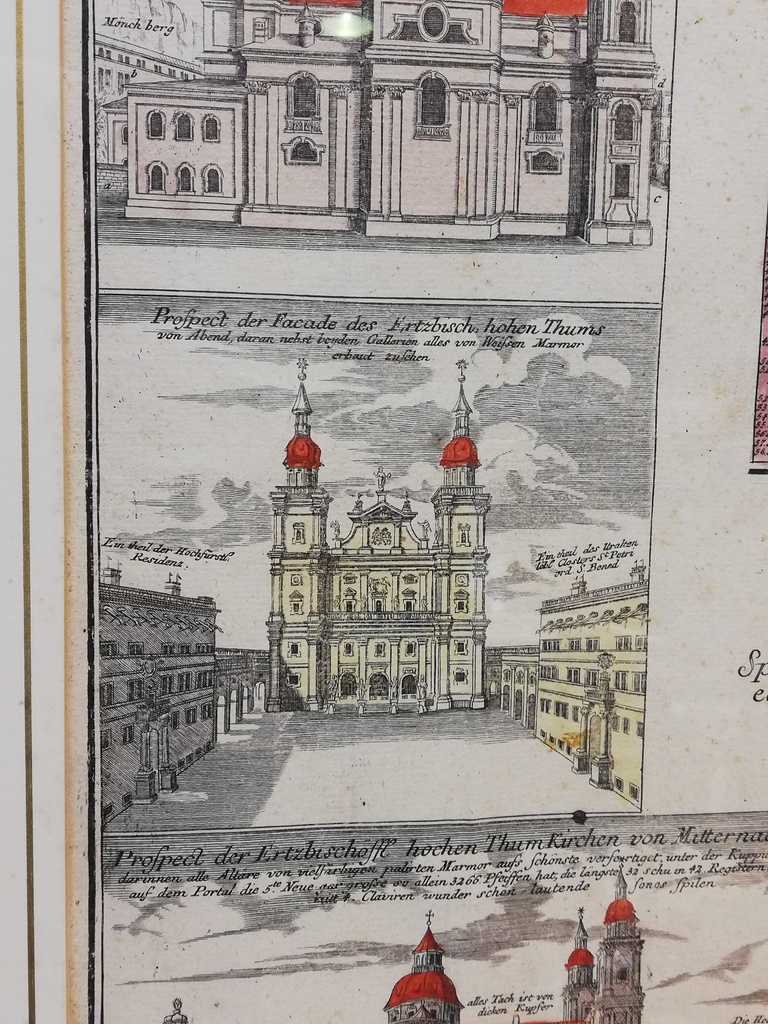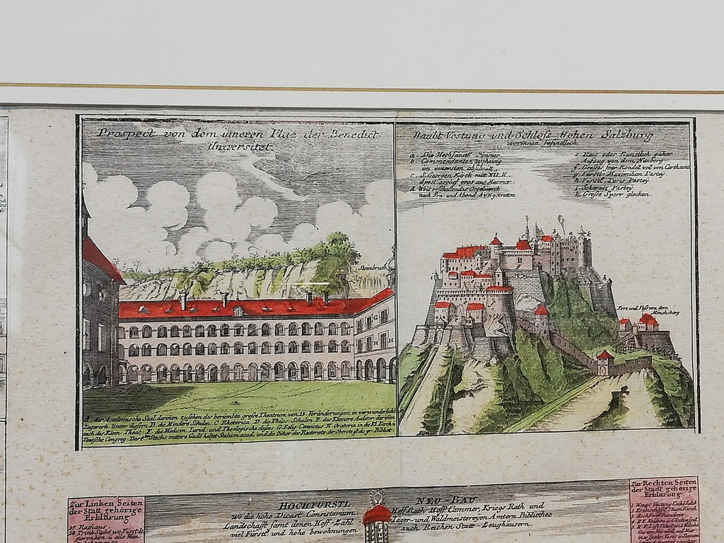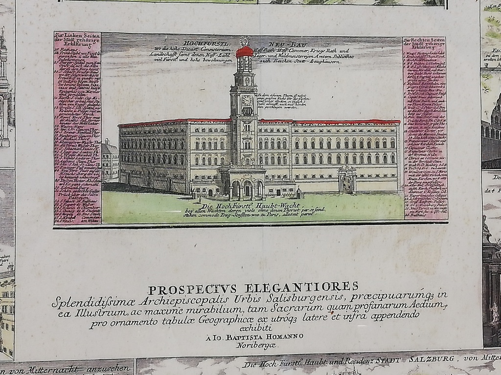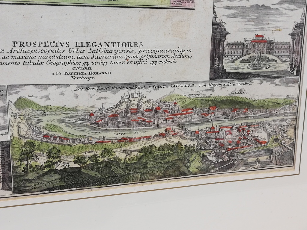 Kolorisierte Kupferstich ,, PROSPECTVS ELEGANTIORES ,, mit 11 Ansichten von Salzburg , aus ,, Homanns Erben Städte-Atlas ,, nach Johann Baptiste Homann, 1762