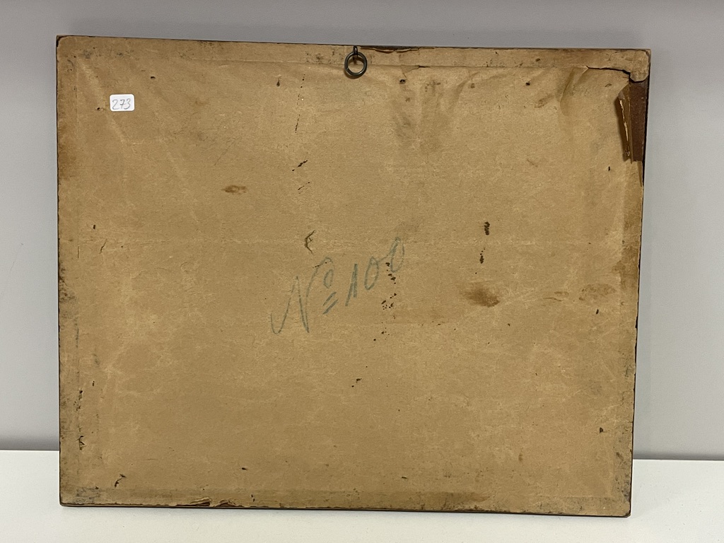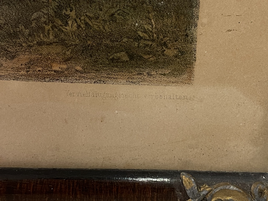 Zustand: Lithographie stark verschmutzt, Teile der Zinnverzierungen des Rahmens abgebrochen