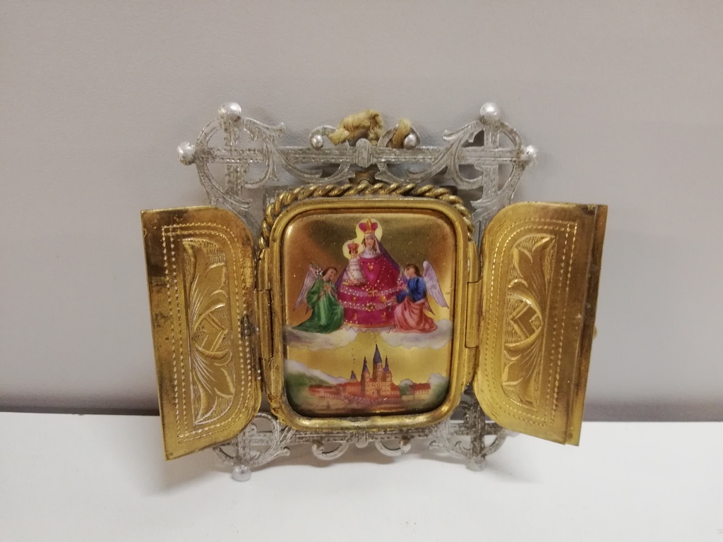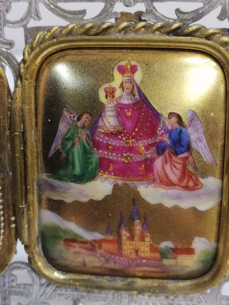 drinnen: Madonna von Mariazell mit Kind flankiert von 2 Engel darunter Wallfahrtskirche Maria Zell, alles auf Goldgrund